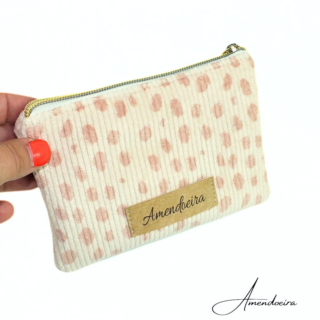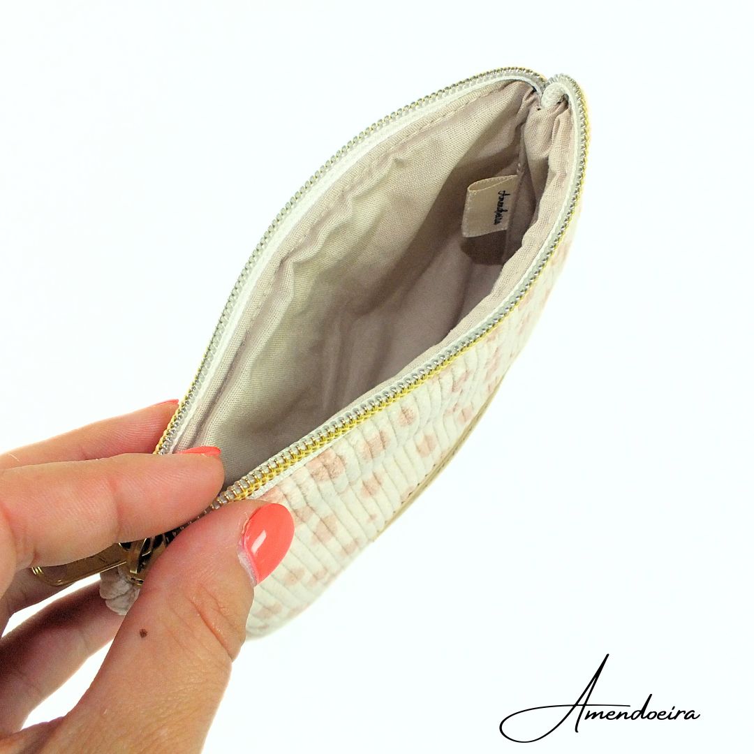 Bolsa porta cartões/ moedas em bombazine com padrão de manchas em rose gold e fundo bege e forro em algodão bege.