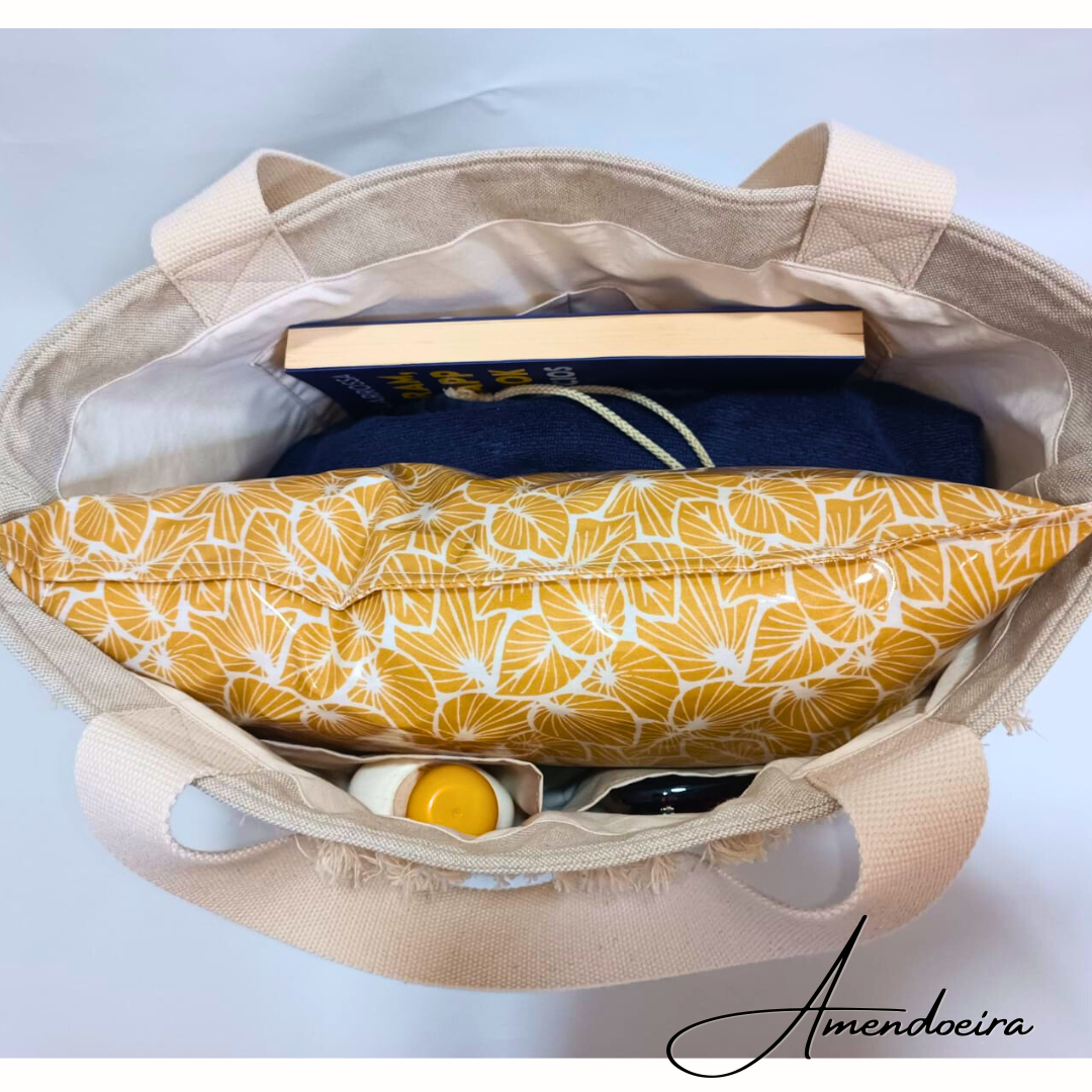 Idas à praia com estilo, dá para levar uma ou duas toalhas, livro, almofada de praia da marca Amendoeira, tem 4 bolsos interiores que dá para colocar o protetor/bronzeador , bolsa de óculos ou carteira.