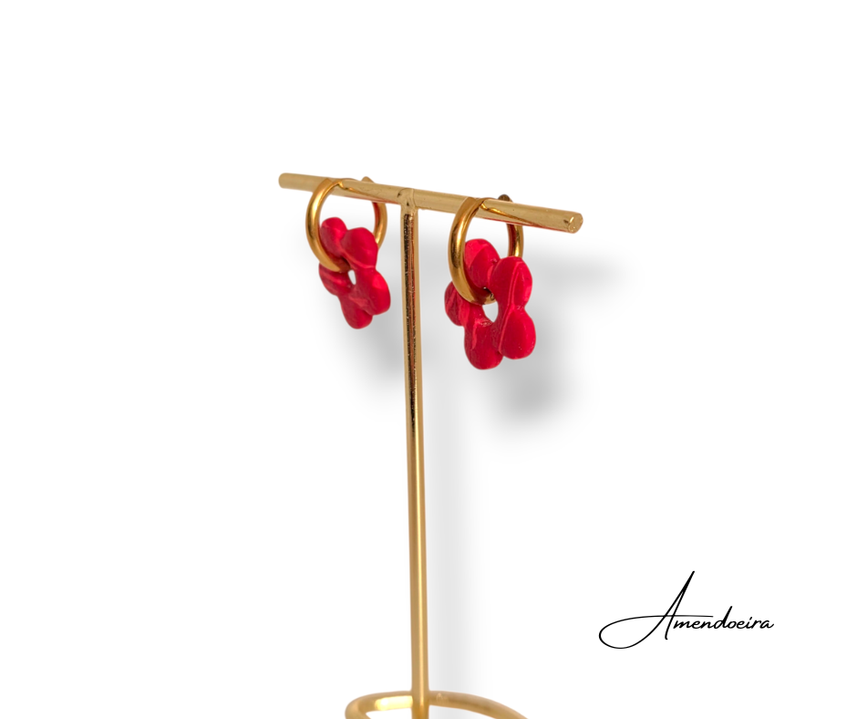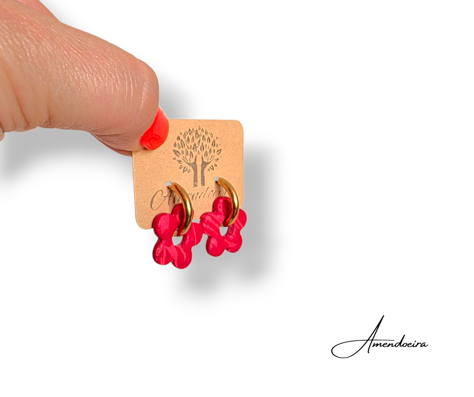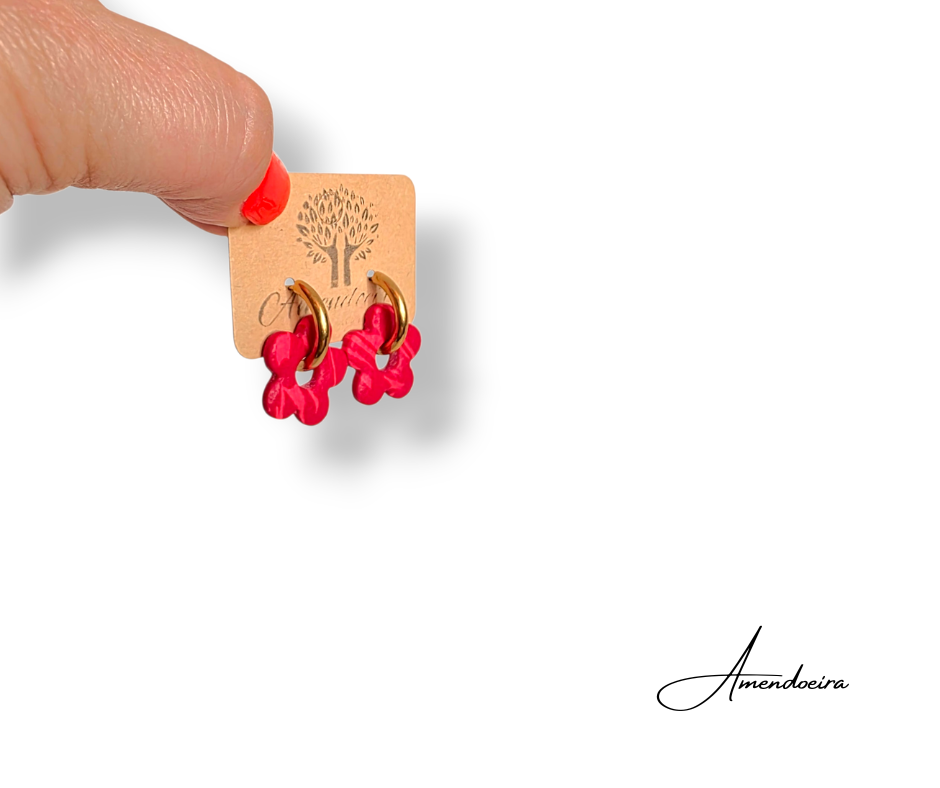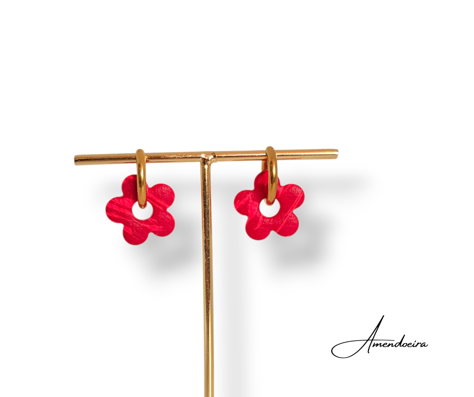 Brincos feitos à mão com um design delicado em forma de flor com um padrão de base vermelho escuro com detalhes em rosa.