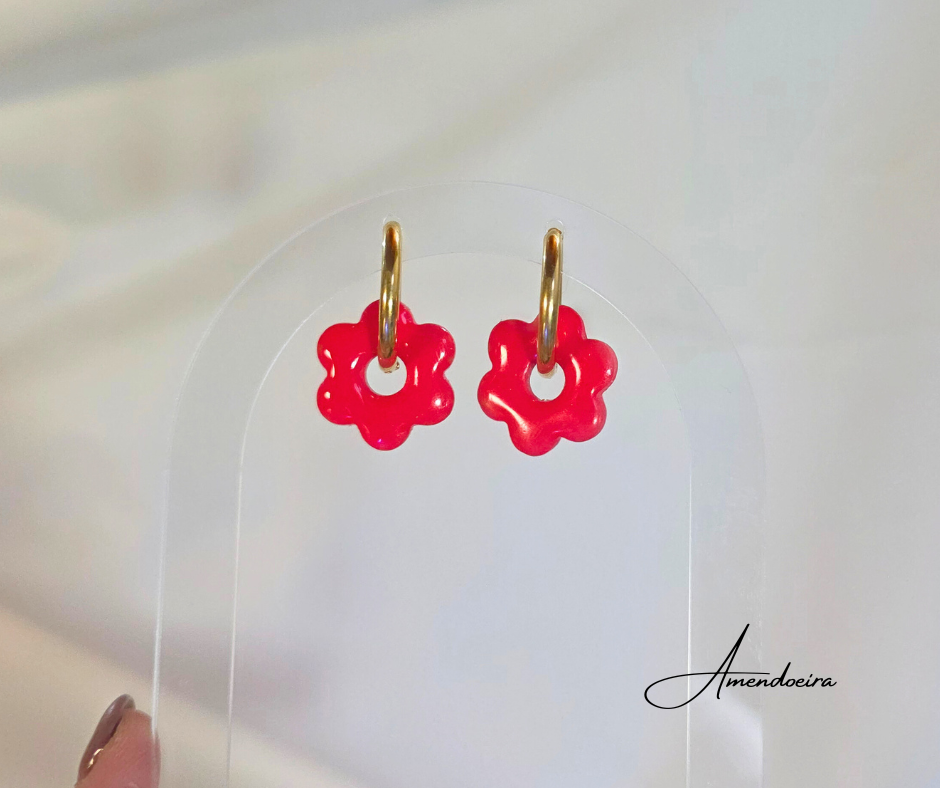Brincos feitos à mão com um design delicado em forma de flor na cor vermelha.