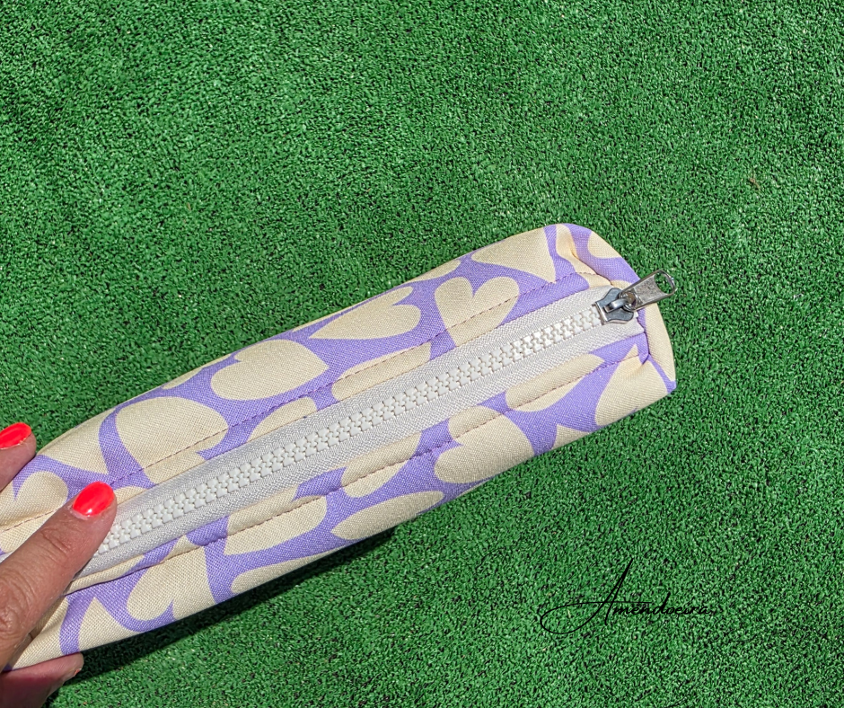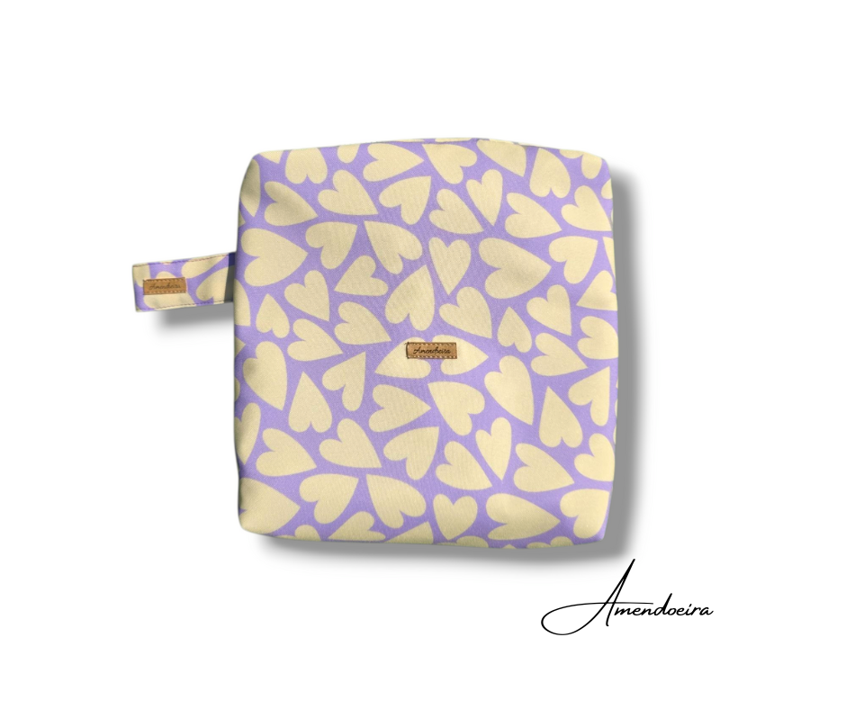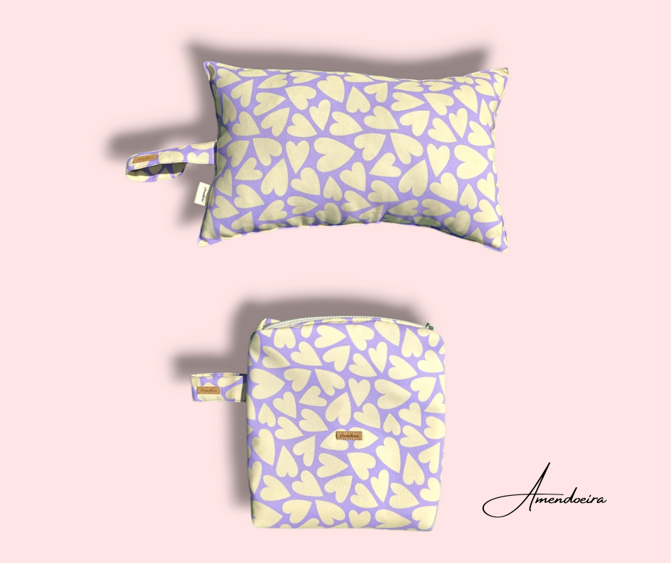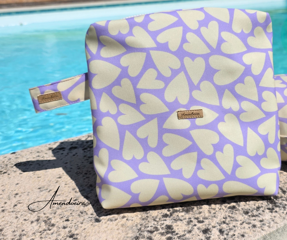 Impermeável no tecido exterior e no forro, tecido exterior fundo lavanda com corações amarelo claro e forro em bege.
