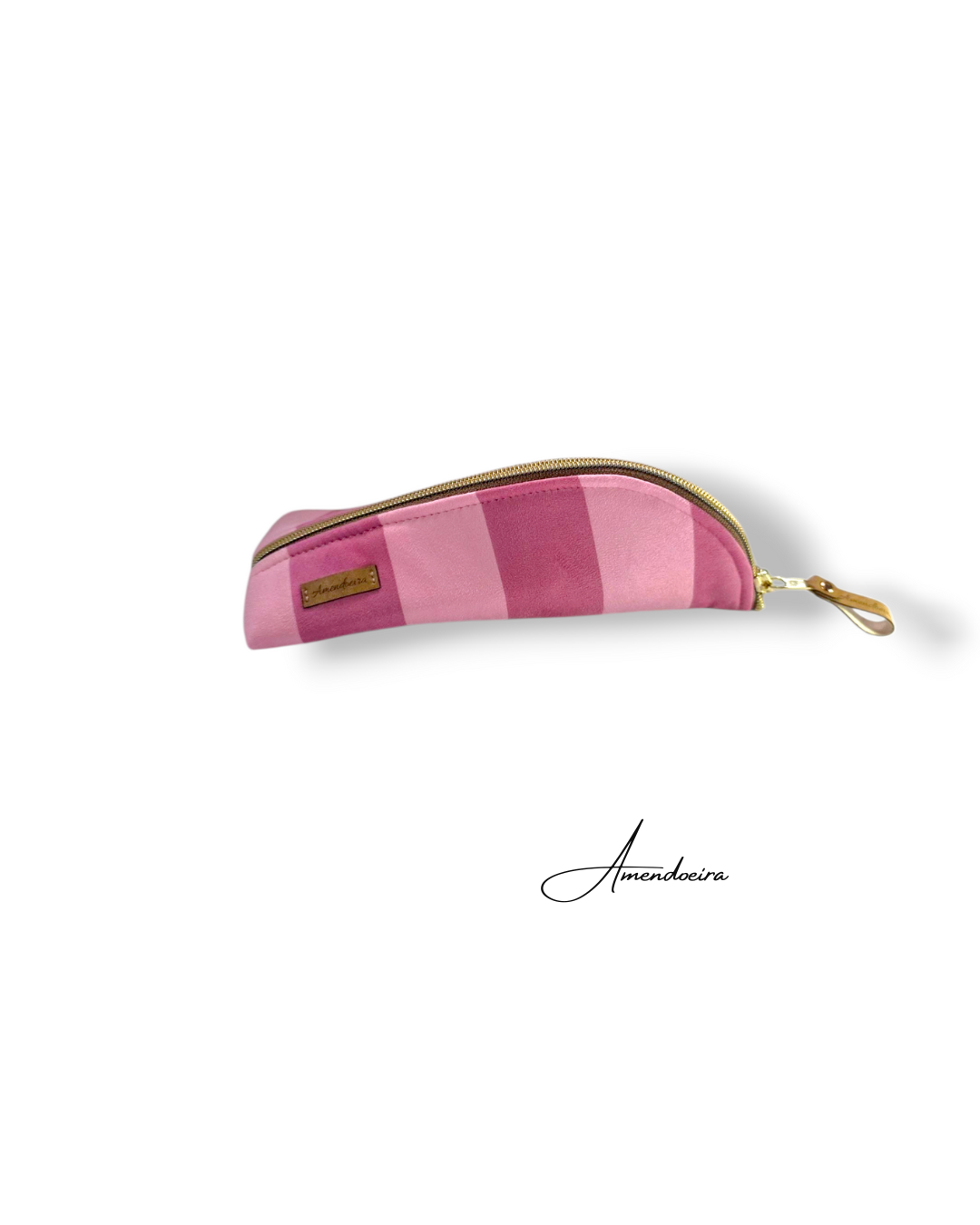 Cada peça é cuidadosamente confecionada, a camurça com um padrão ás riscas largas na cor malva e rosa e com forro interior é impermeável para ser fácil de limpar, refletindo o cuidado artesanal que caracteriza a marca Amendoeira.