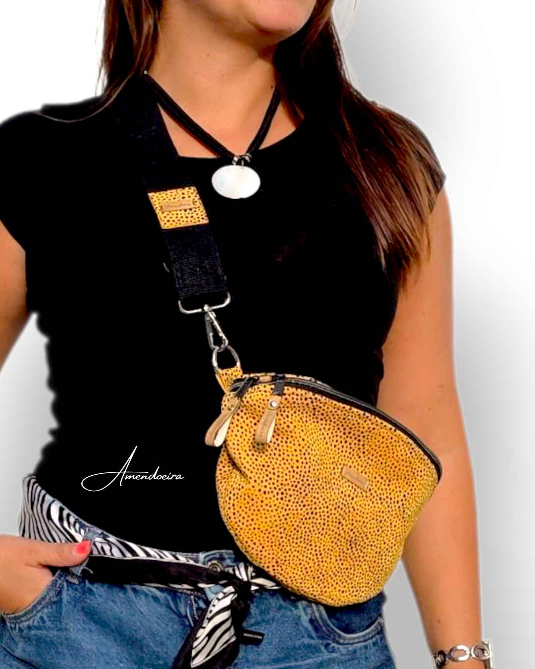 O seu tom amarelo vibrante com pintas irregulares pretas e com textura exótica torna-a uma peça cheia de personalidade, perfeita para dar um toque de cor e estilo a qualquer look.