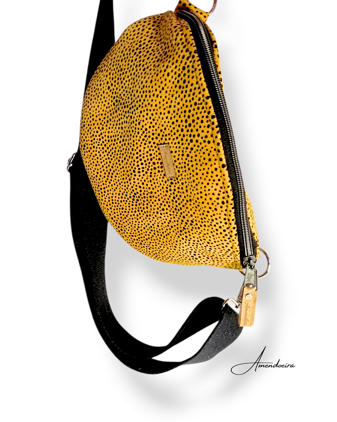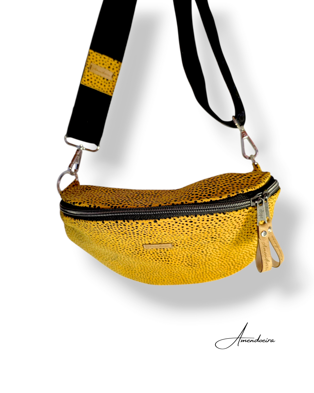 Material: Pele genuína amarela com pintas irregulares pretas