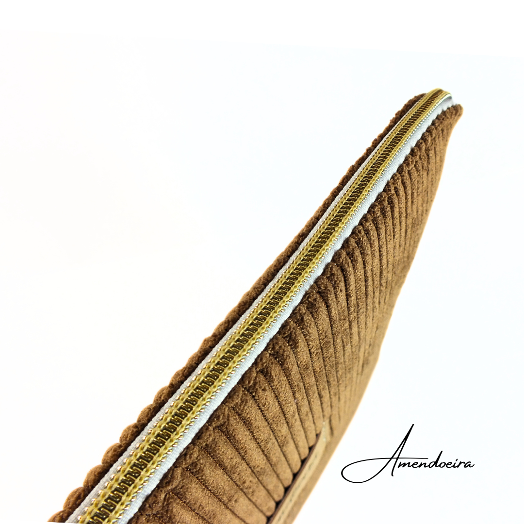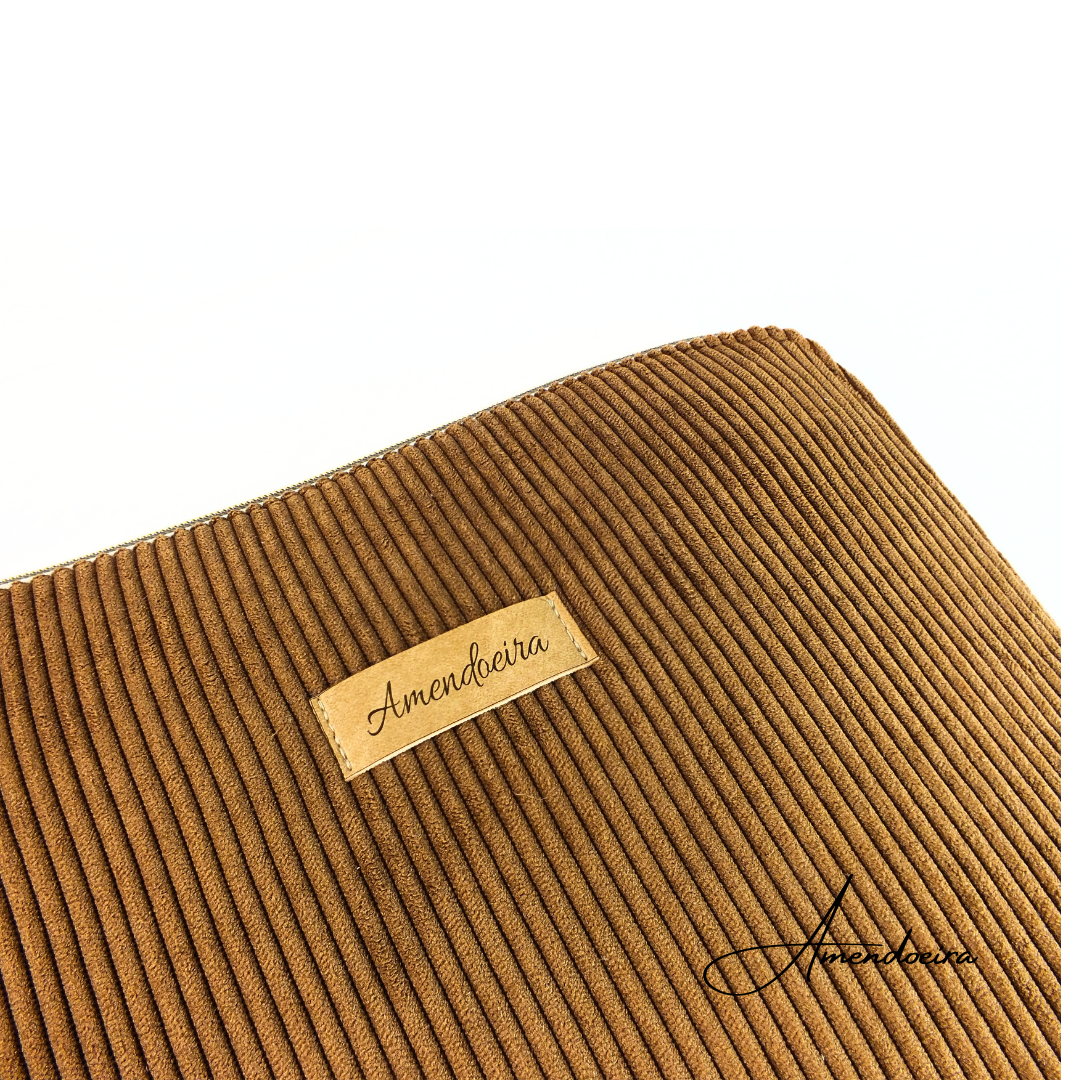 Feita à mão em Portugal, com bombazine cor camel no exterior, tecido 100% algodão no forro com padrão floral e fecho metalizado em dourado.