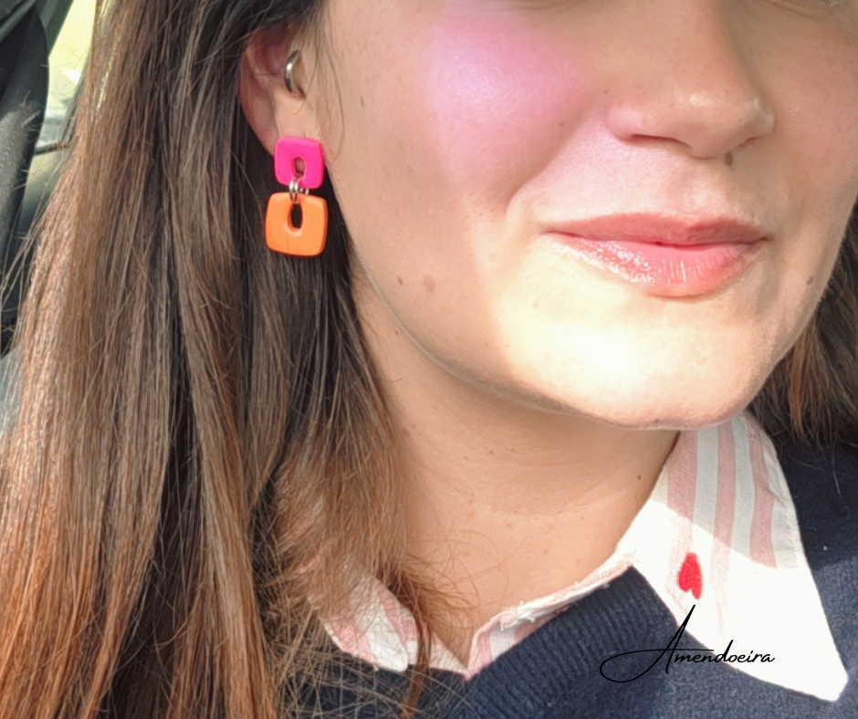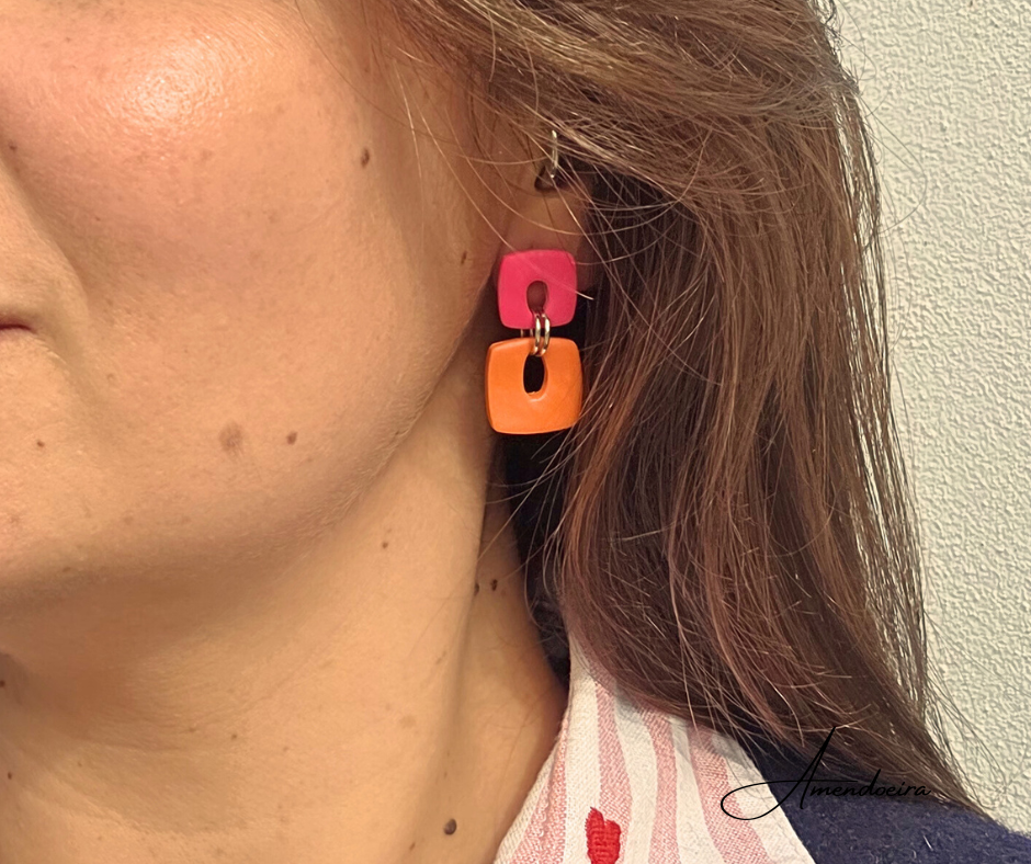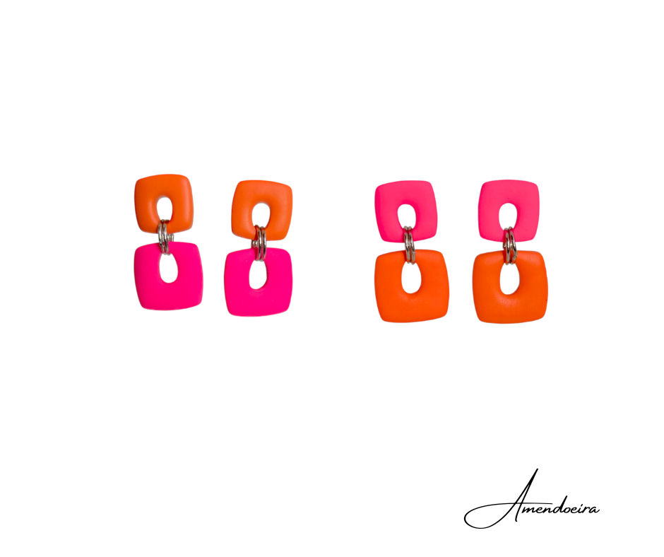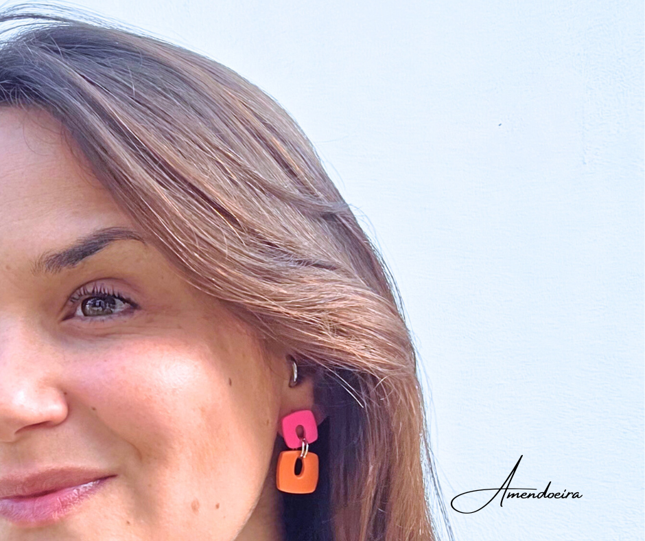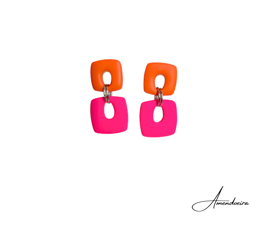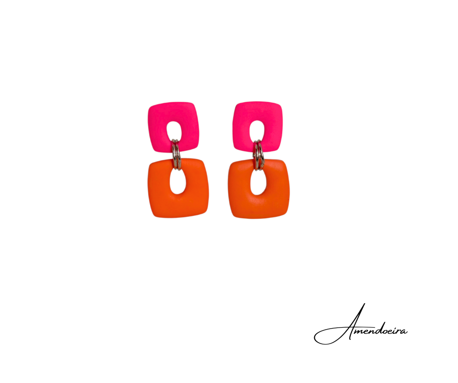 Brincos feitos à mão em polymer clay, com um design moderno de formas geométricas duplas que combinam o rosa vibrante com o laranja intenso.