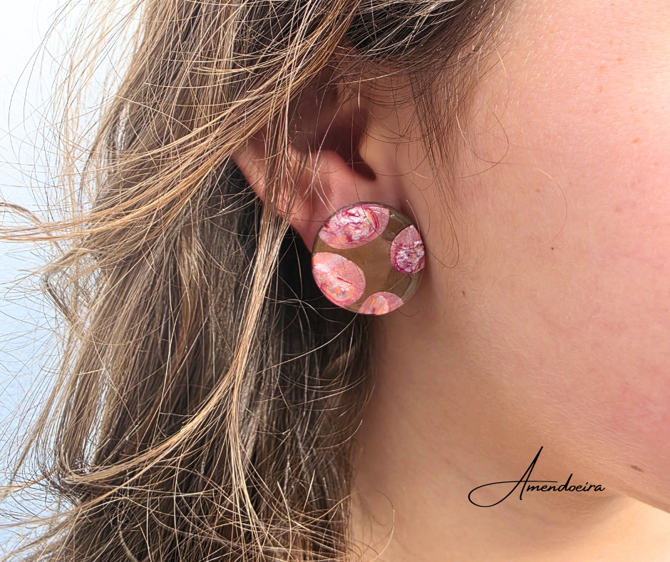 Estes brincos destacam-se pelo seu design contemporâneo e artístico, onde tons quentes de terracota se combinam harmoniosamente com detalhes em rosa marmoreado, criando uma peça única e cheia de personalidade. Cada par é feito à mão, tornando-o exclusivo e irrepetível.