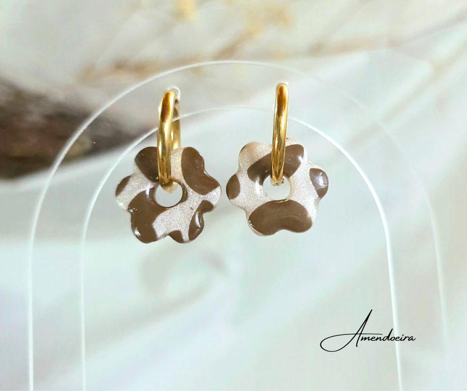 Brincos feitos à mão com um design delicado em forma de flor num padrão feito à mão e irrepetível em polimer clay, na cor pérola escura brilhante e castanho.