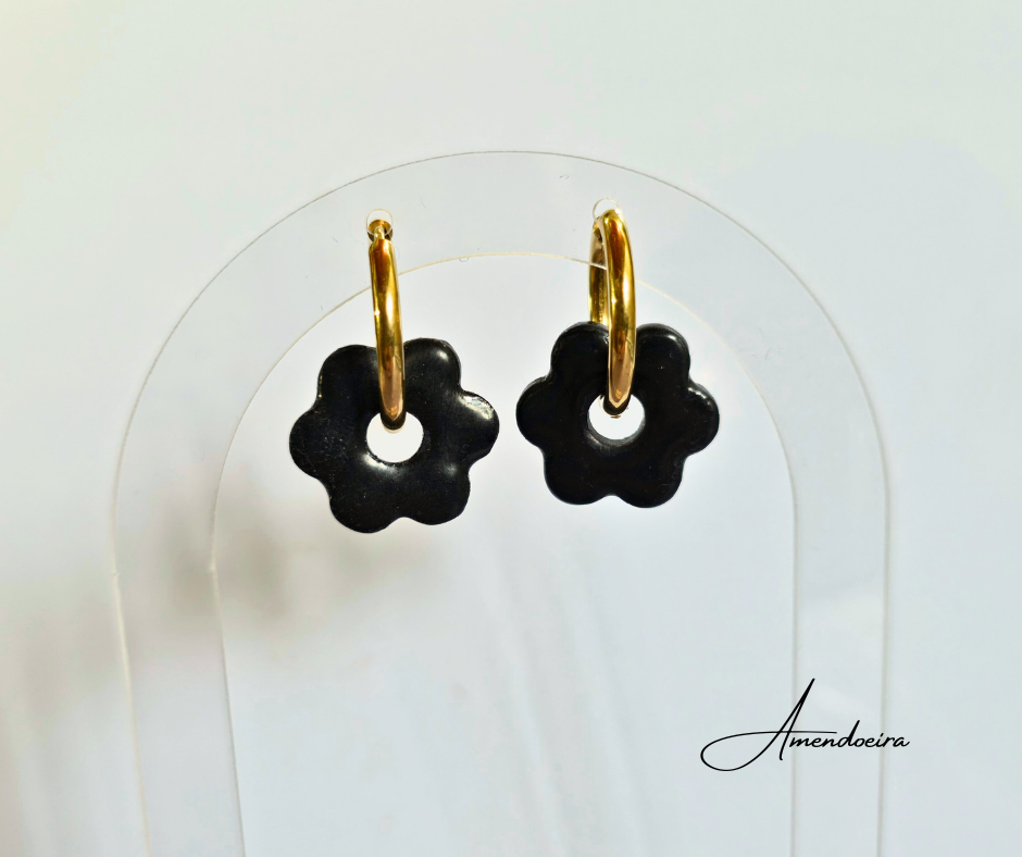 Brincos feitos à mão com um design delicado em forma de flor na cor preta.