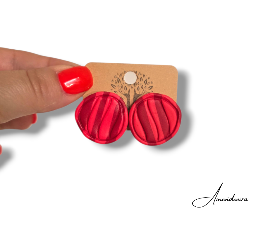 Brincos redondos em tons vibrantes de vermelho e rosa, feitos à mão com um padrão riscas que cria um efeito elegante e cheio de movimento. O design moderno e artístico torna esta peça perfeita para quem gosta de acessórios simples, mas com personalidade.