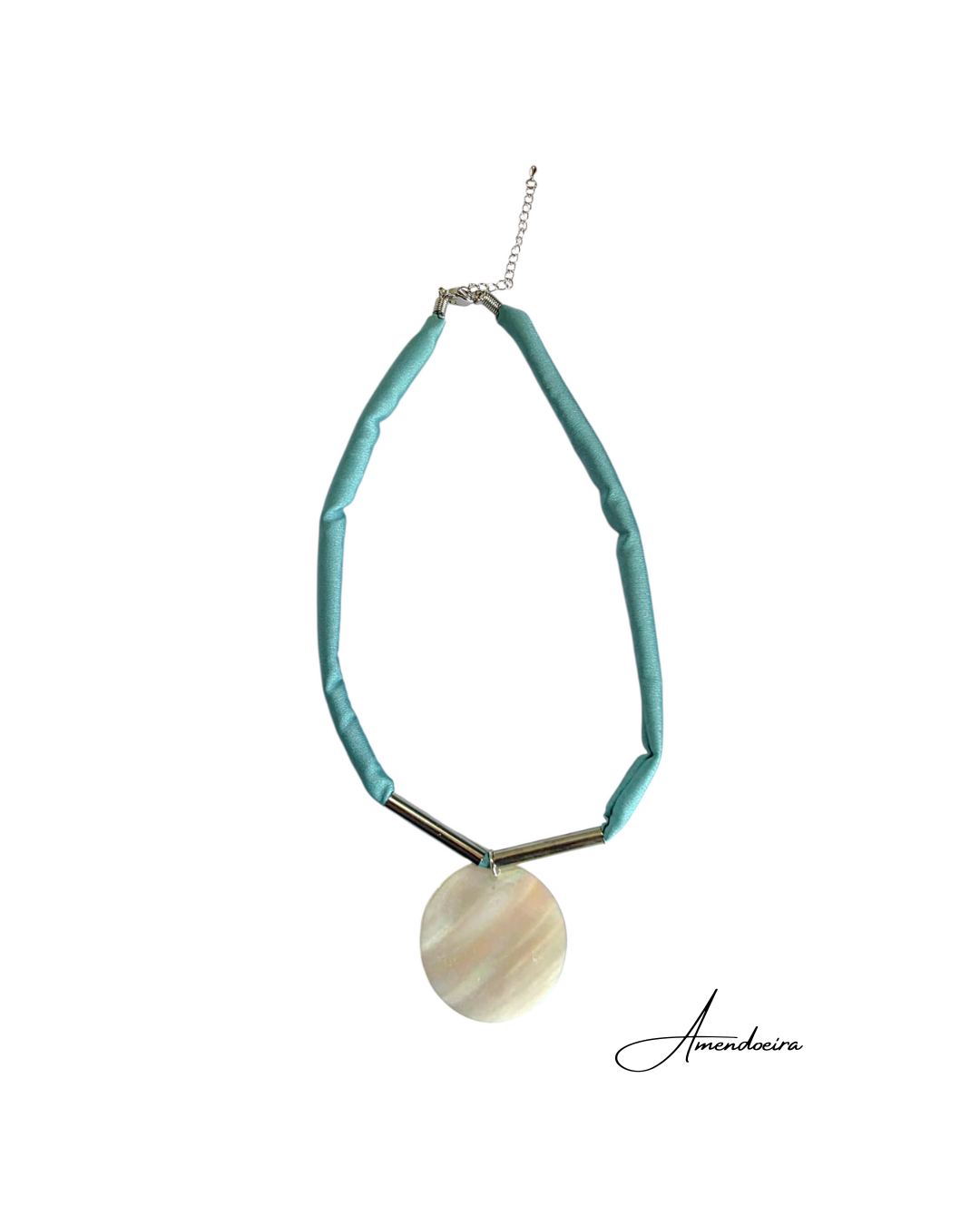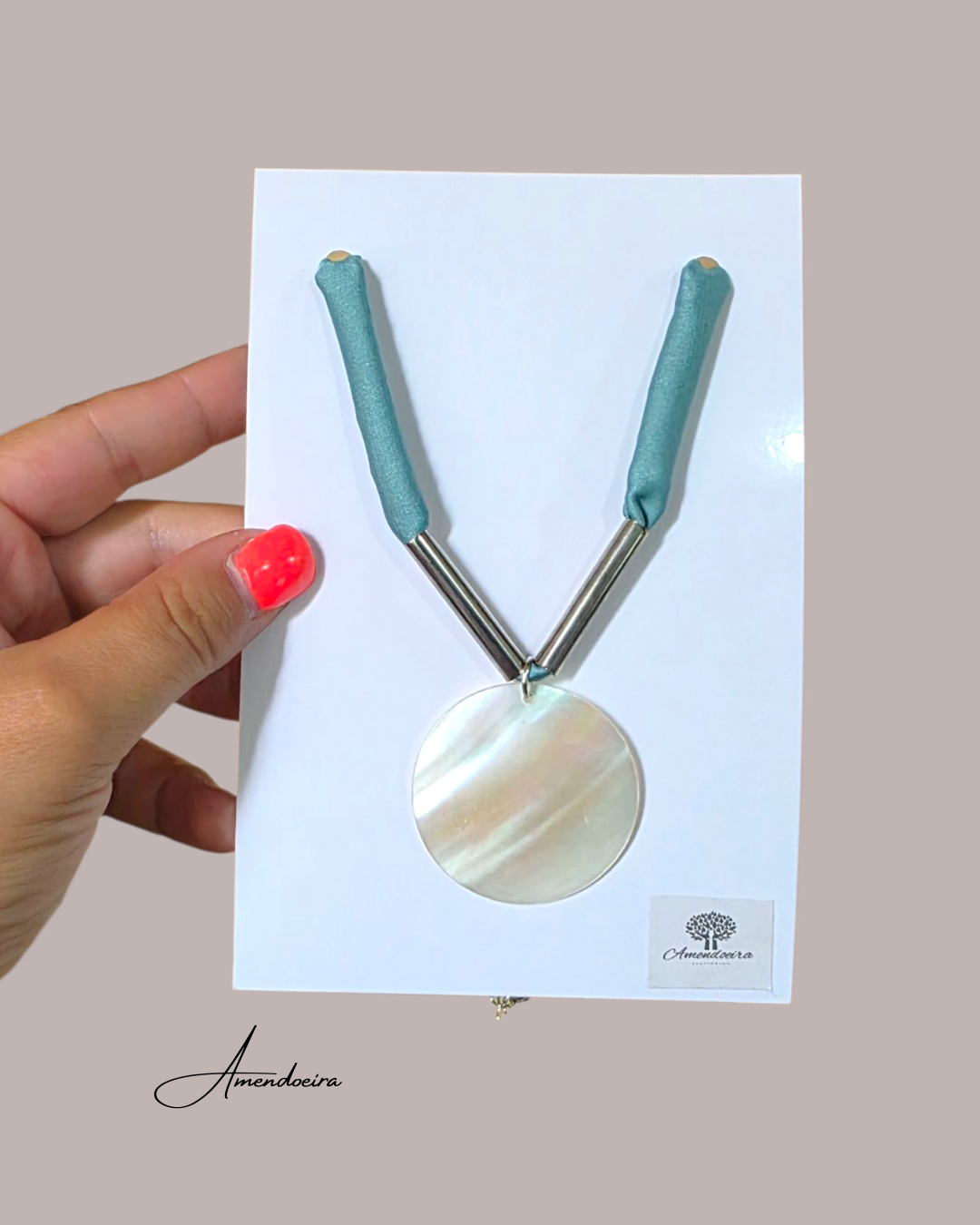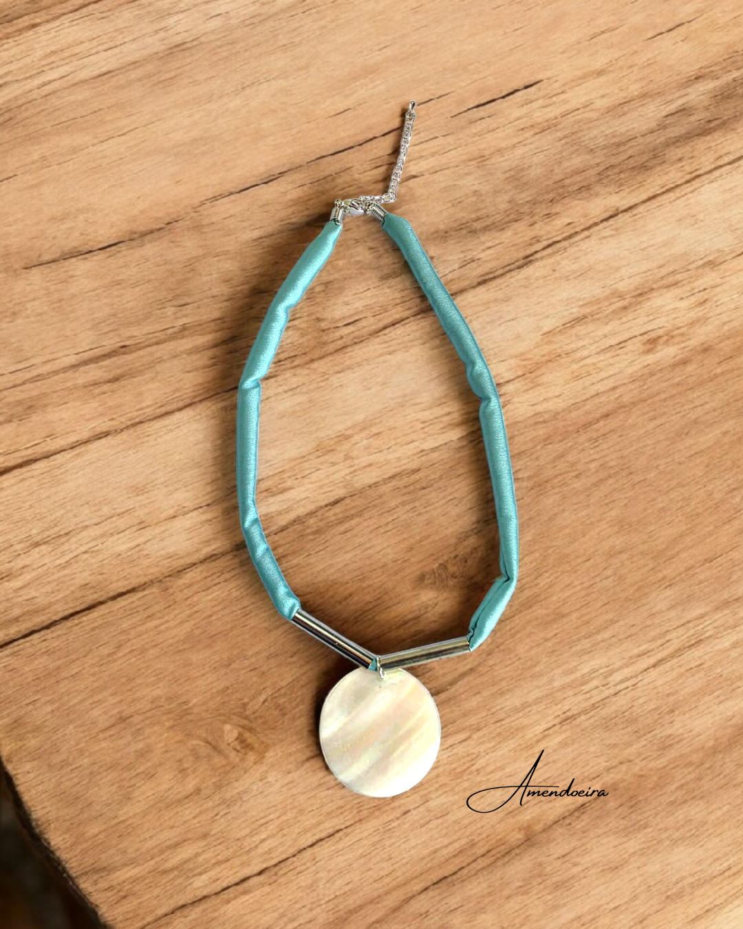 O Colar Aurora é a combinação perfeita entre simplicidade e sofisticação. Feito à mão com tecido de cetim na cor azul água, suave e confortável ao toque, é finalizado com um pendente redondo em madrepérola natural que reflete a luz com delicados tons iridescentes.