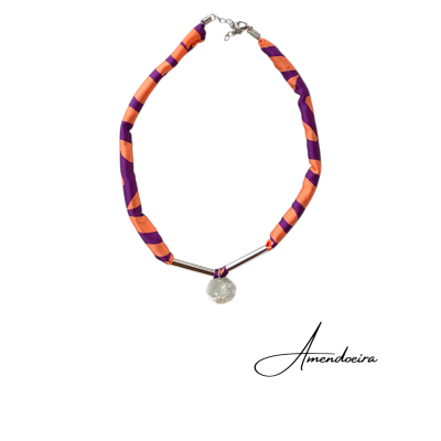 Destaque-se com o colar Bella, elegante e original, que combina um tecido suave com um padrão moderno em tons de roxo e laranja e com um pendete de Madrepérola natural que acrescenta um toque de sofisticação.