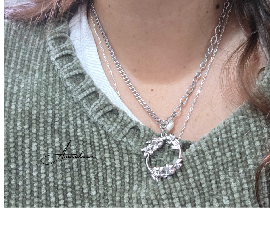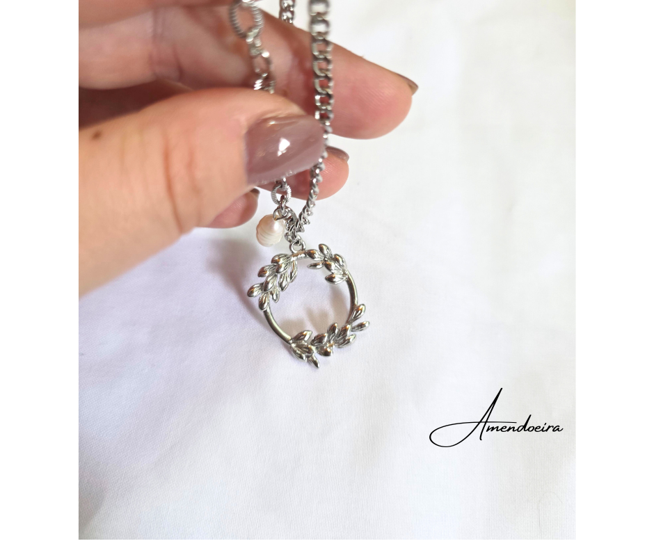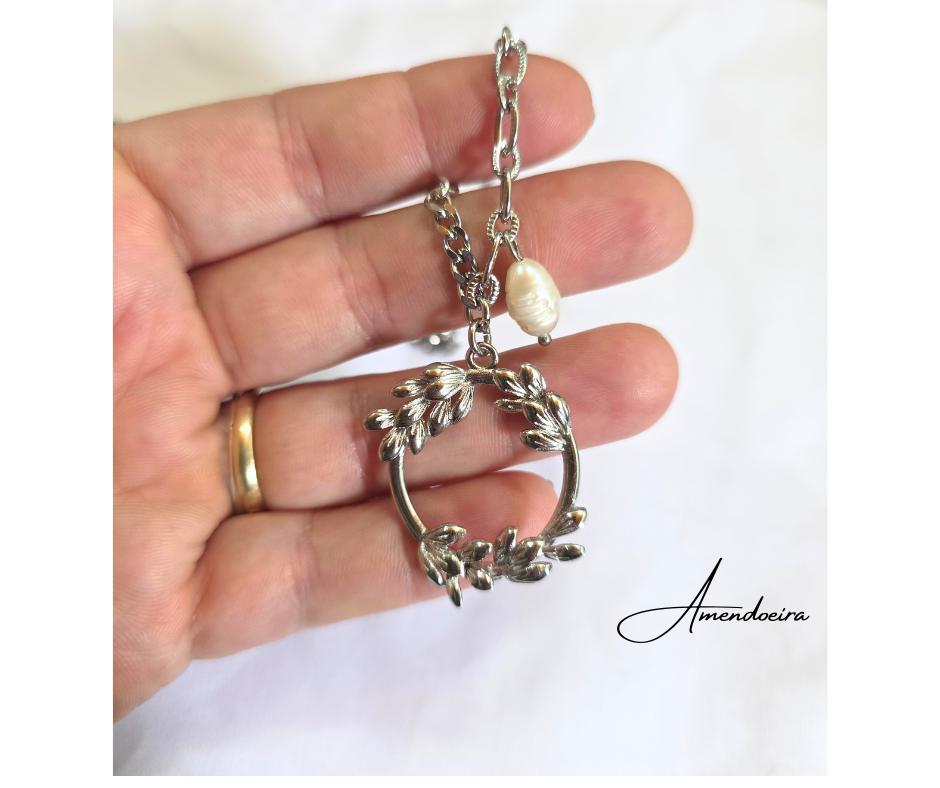 Um colar que combina simbolismo com um pendente em forma de coroa de louros representa vitória, força e renovação. A pequena pérola natural adiciona um toque de suavidade e elegância, criando um contraste harmonioso.