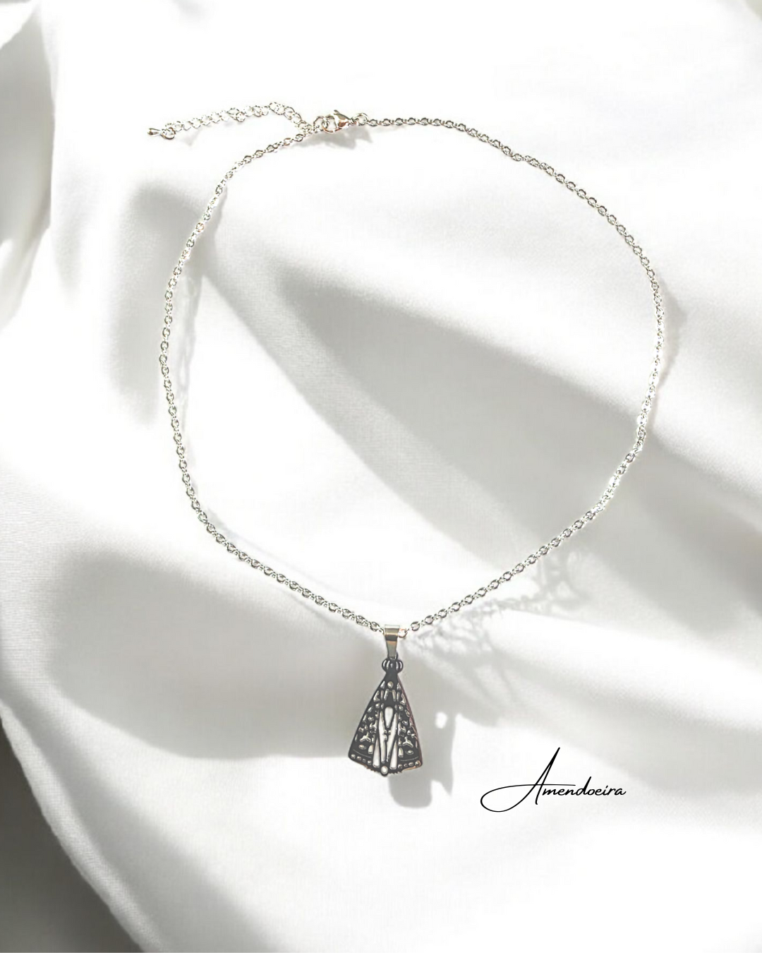 Um colar que carrega no seu centro a imagem serena da Nossa Senhora — símbolo de amor, proteção e luz.