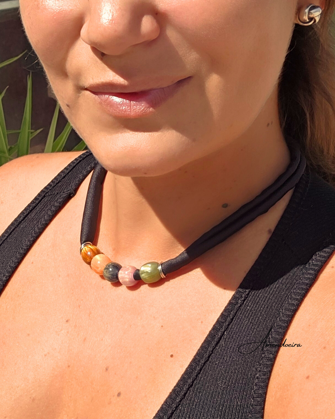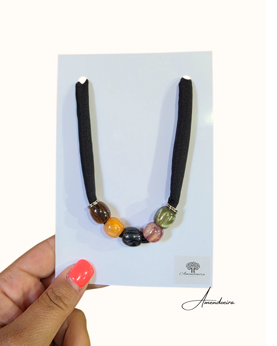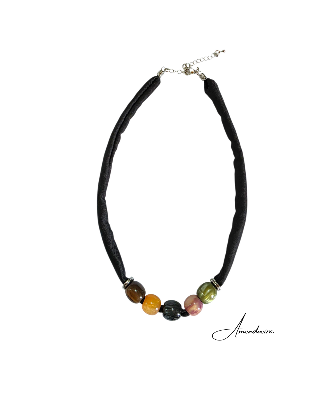Feito á mão com cetim e com 5 contas em resina em tonalidades variadas (âmbar, verde, rosa, preto e castanho), que trazem harmonia e sofisticação a qualquer look.