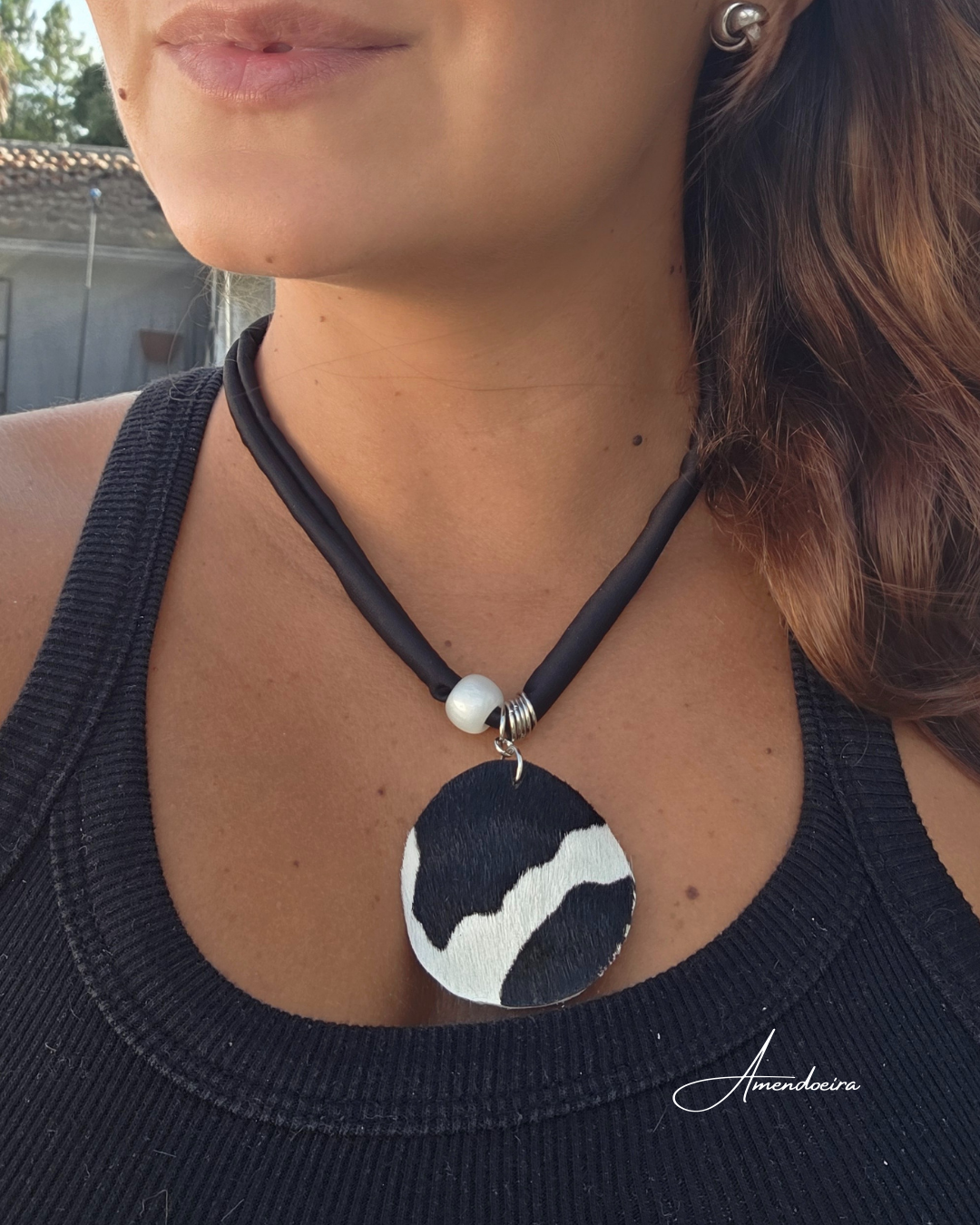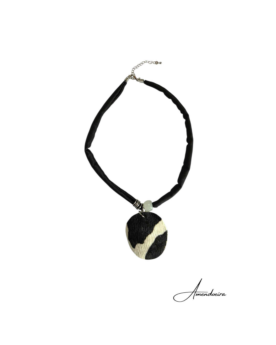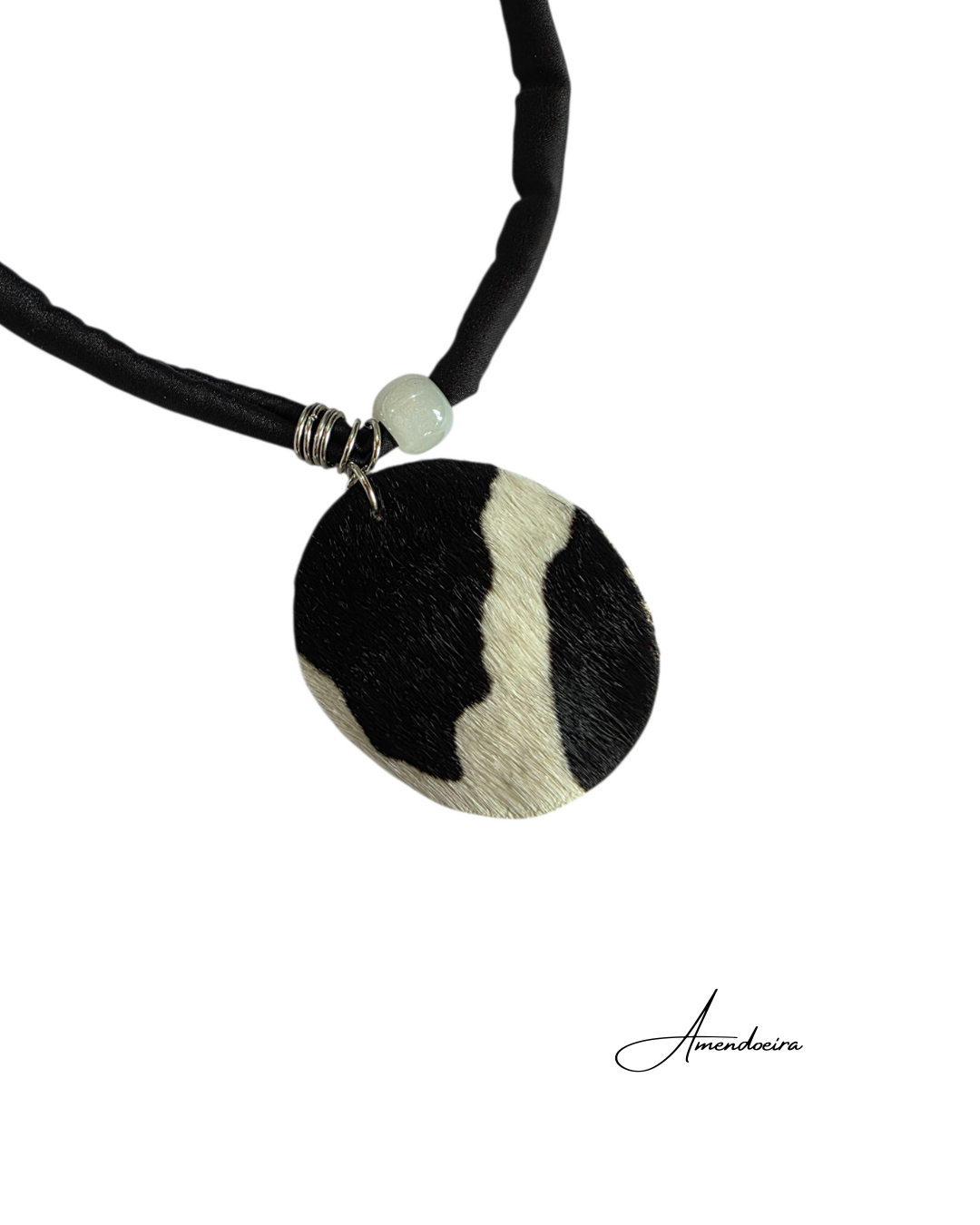 O Colar Savanna combina um pendente em pele natural com pêlo com padrão preto e branco único, tornando cada peça irrepetível.