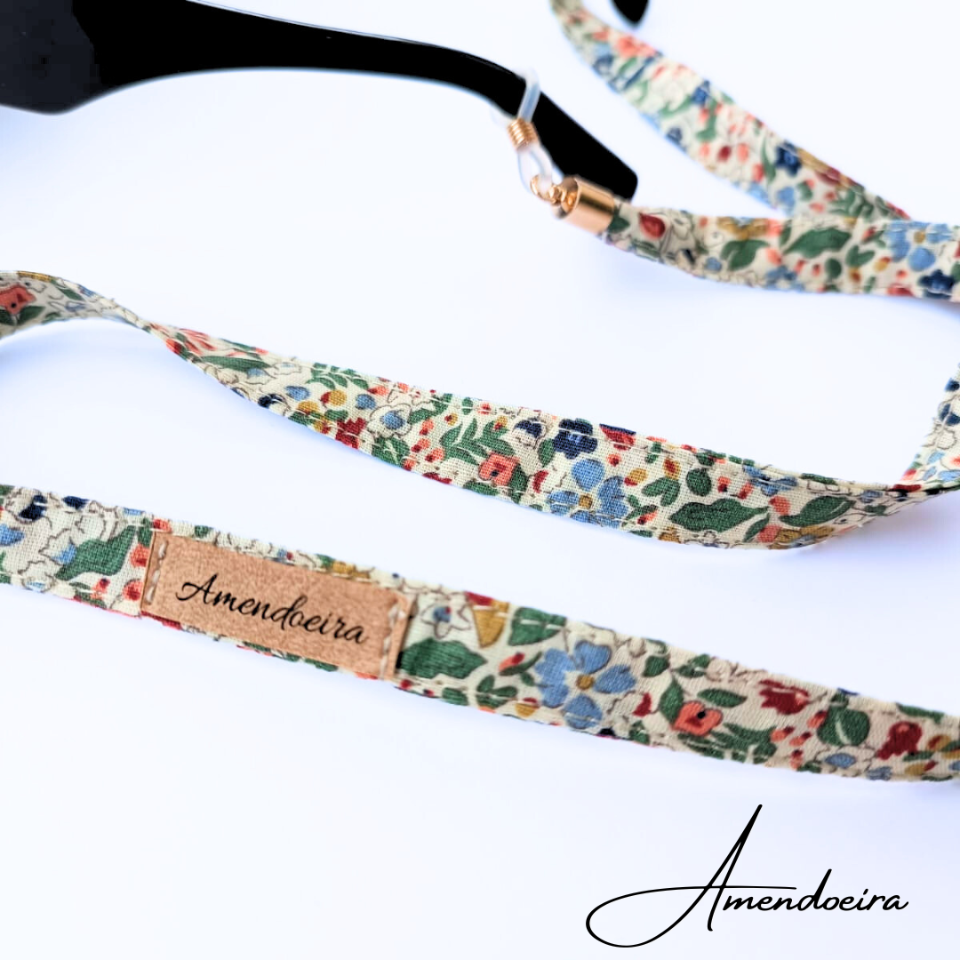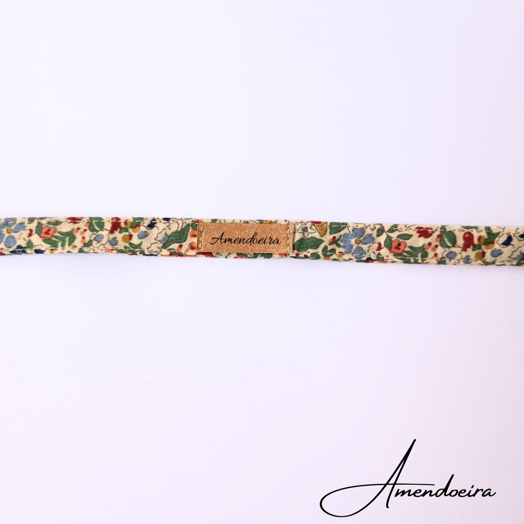 Feita em tecido 100% algodão com estampado floral em tons verde, azul marinho, bordeaux, malva e mostarde me fundo bege com terminação em dourado.