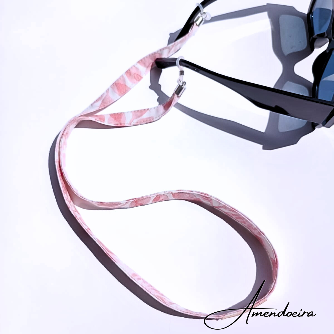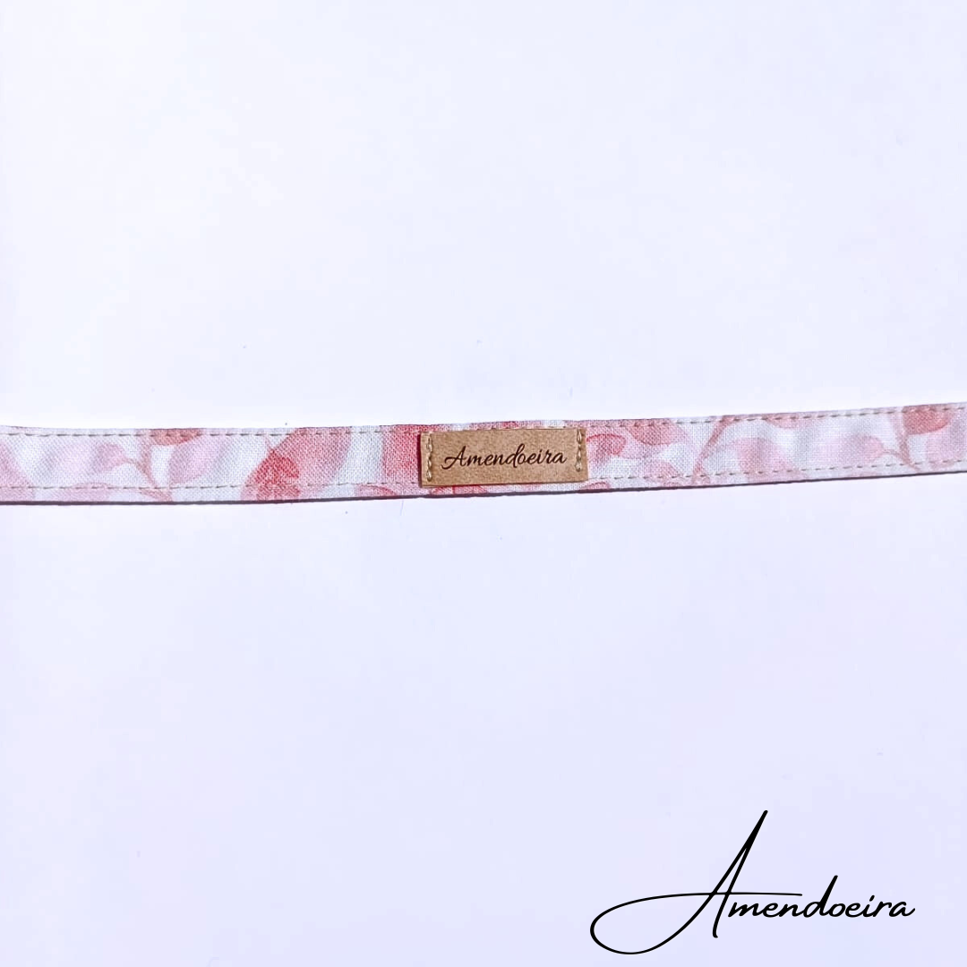 Feita em tecido 100% algodão com padrão de folhas rosa em fundo beg e com terminação em prateado.