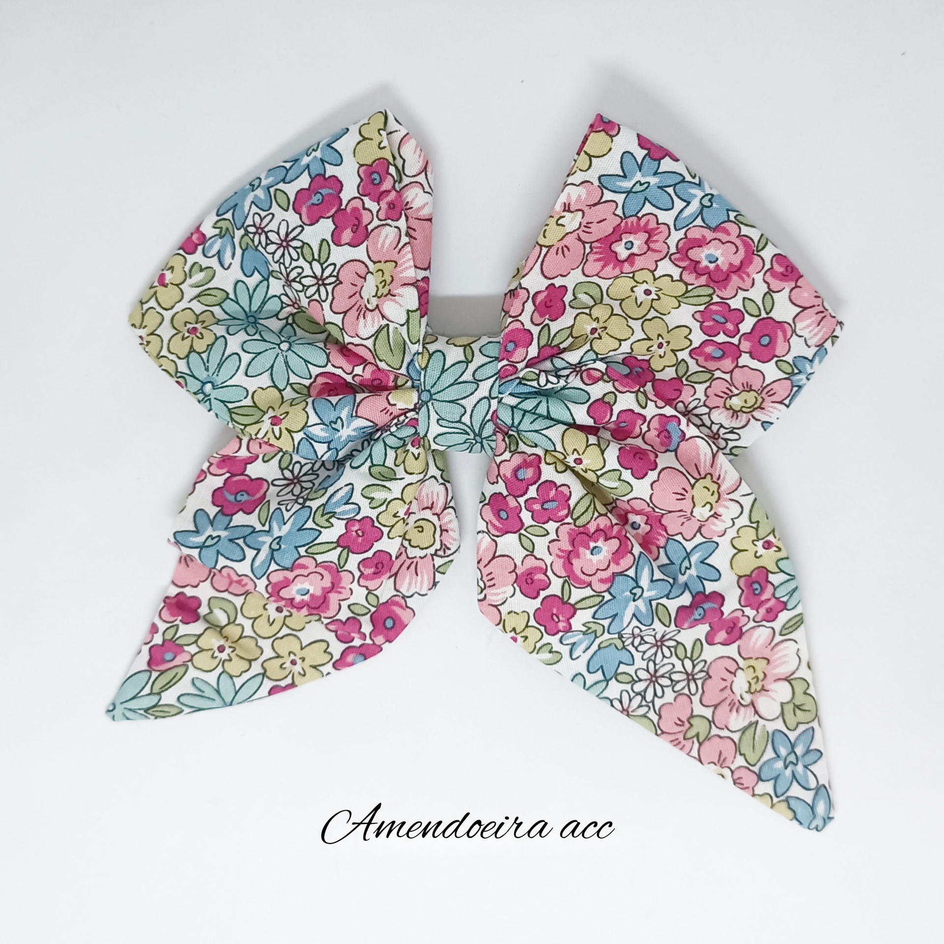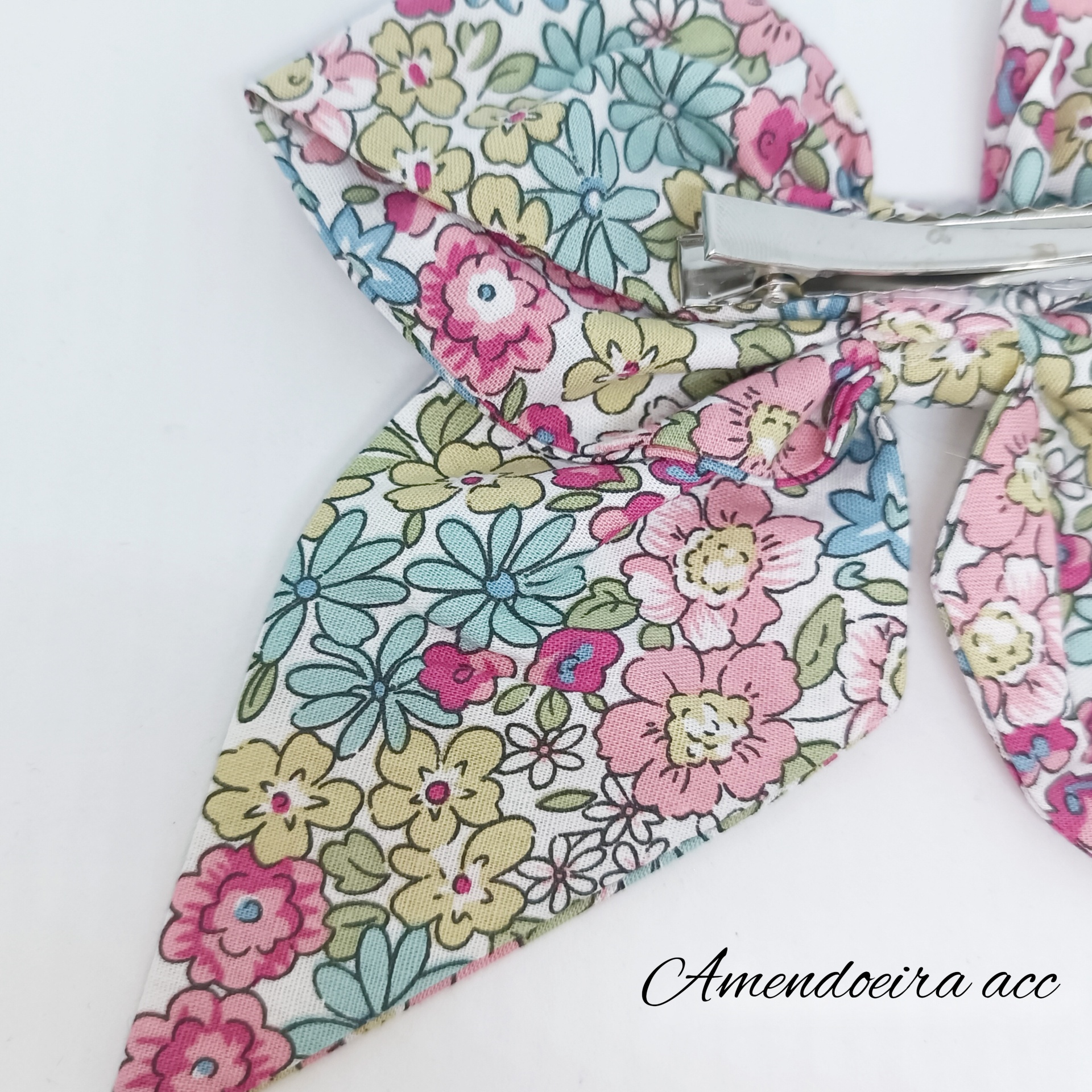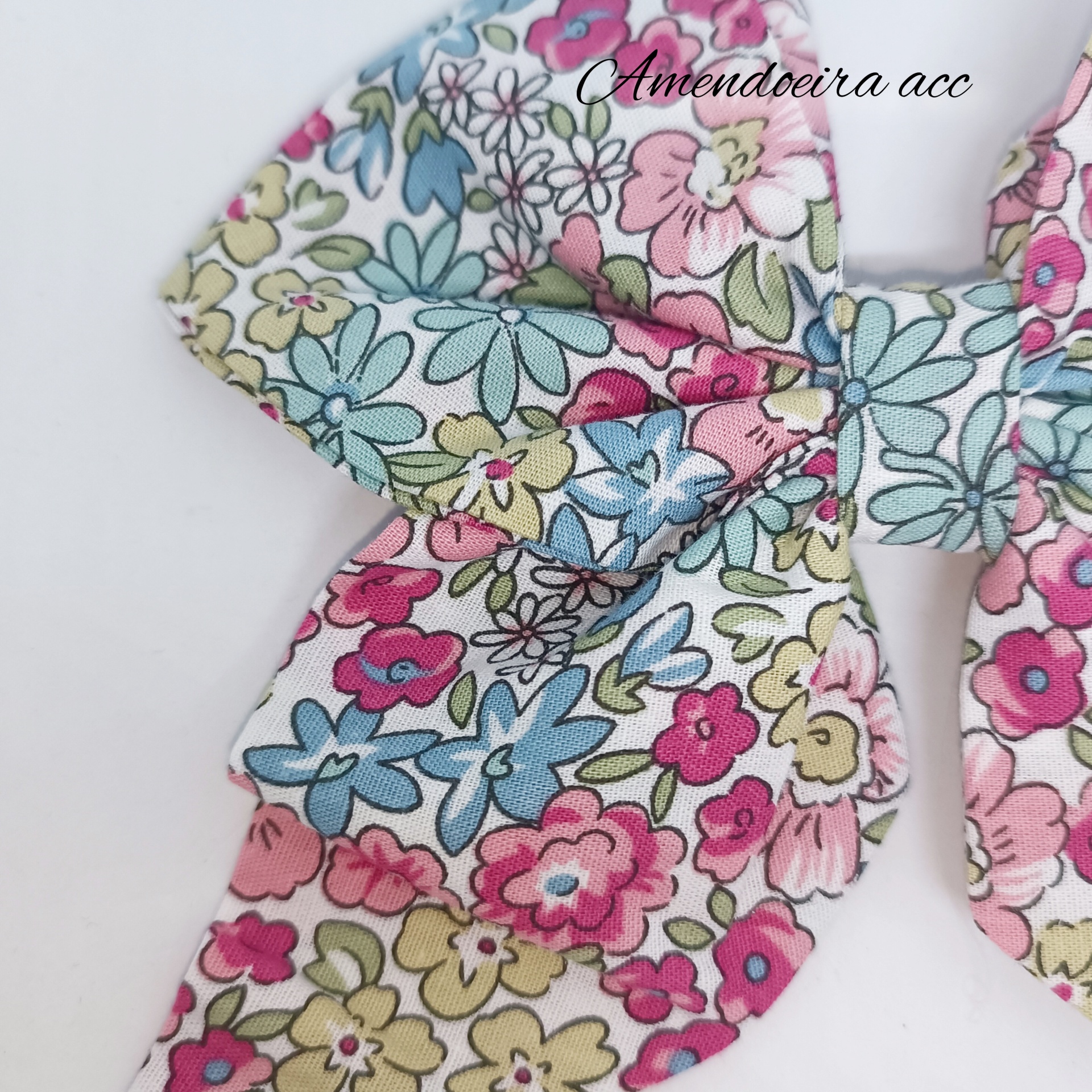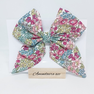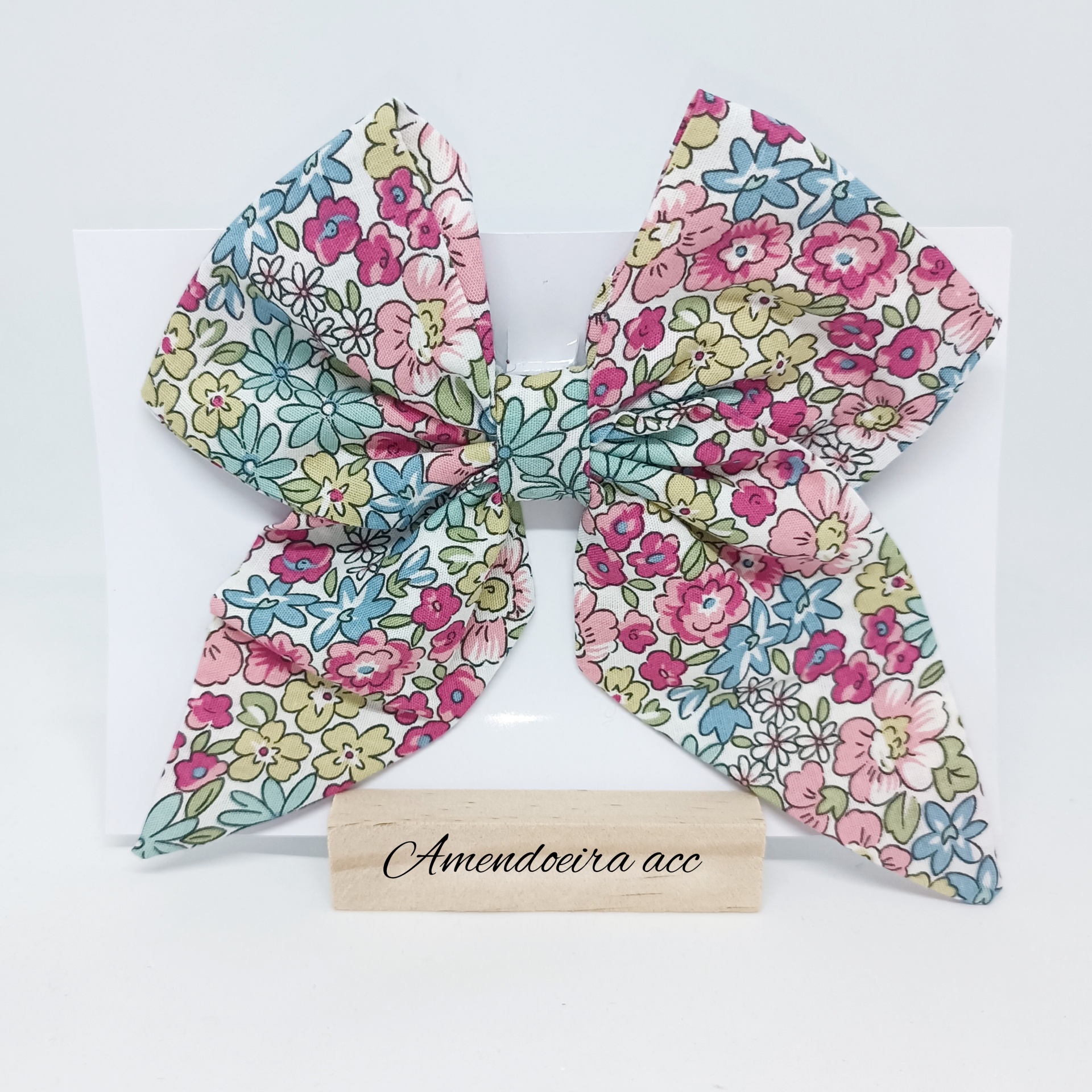 Laço para cabelo com flores em rosa velho, rosa forte,azuis, verde meta e verde lima num fundo branco.
