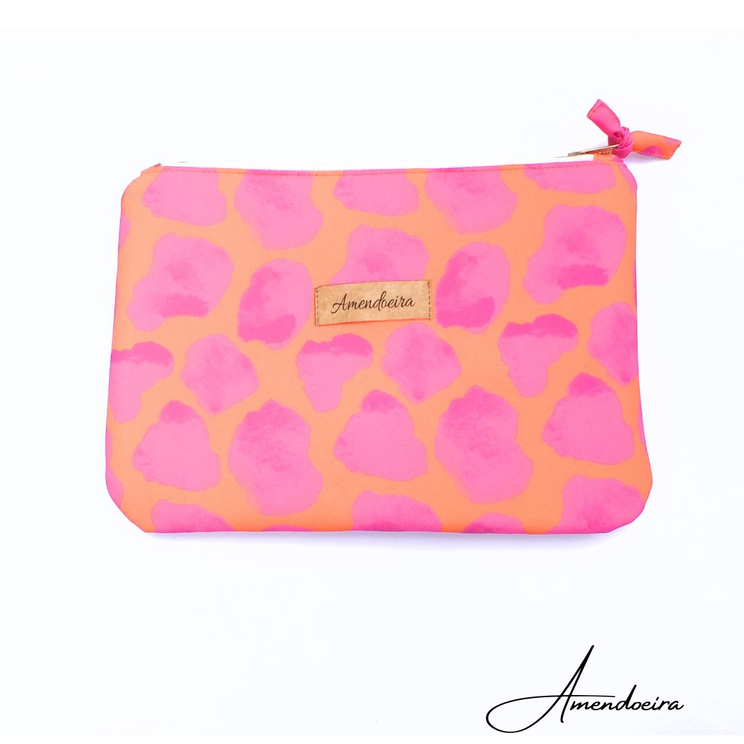 - Bolsa com tecido exterior padrão girafa com fundo laranja e manchas em rosa impermeàvel e forro branco impermeável