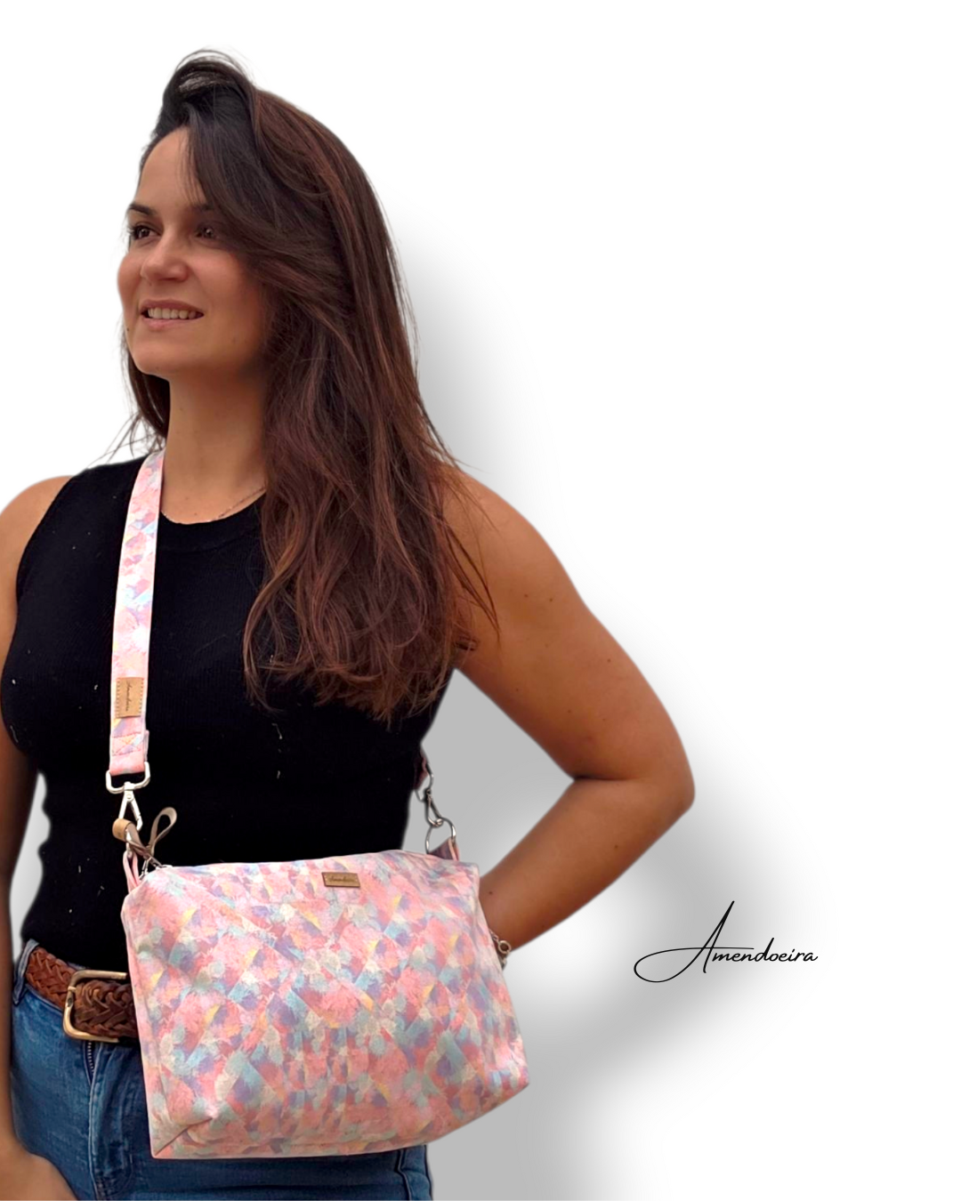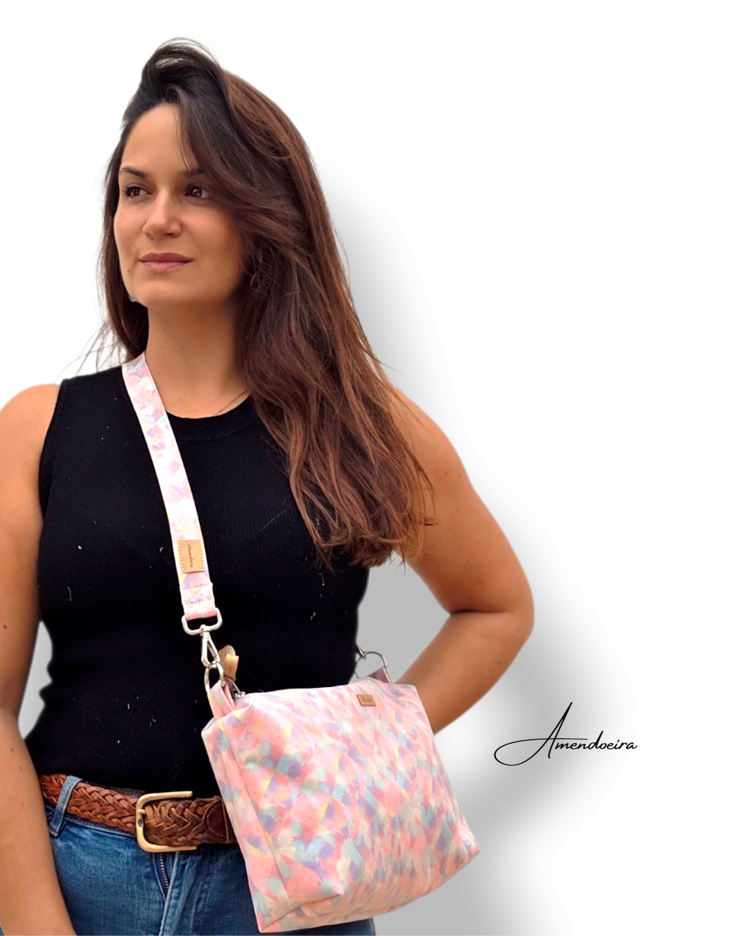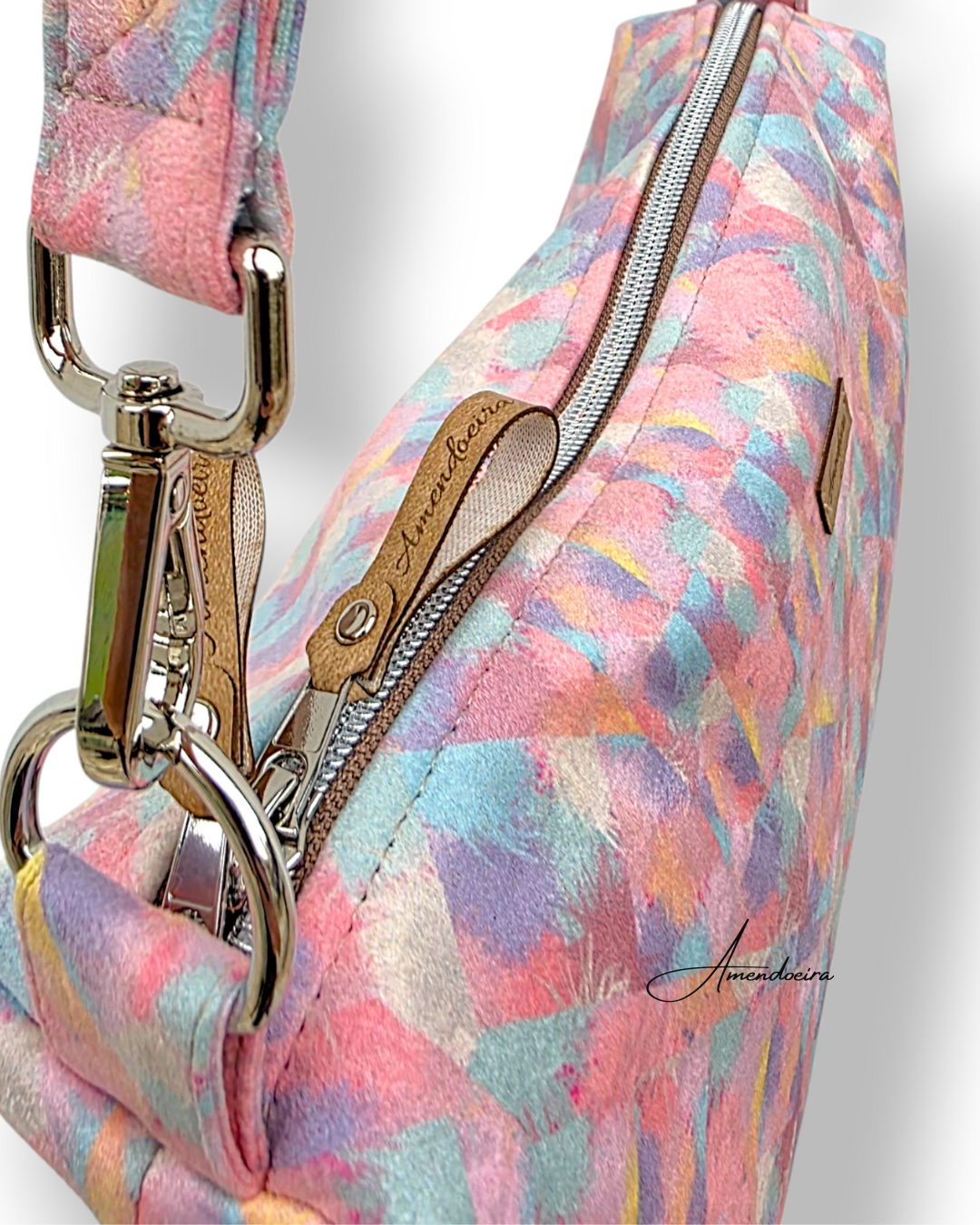 Exclusiva com tecido de camurça no exterior numa elegante mistura de cores de rosa, malva, azul, lilás e bege. Com este colorama na tua mala é fácil de conjungar.