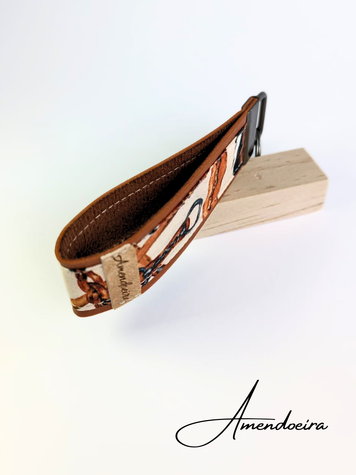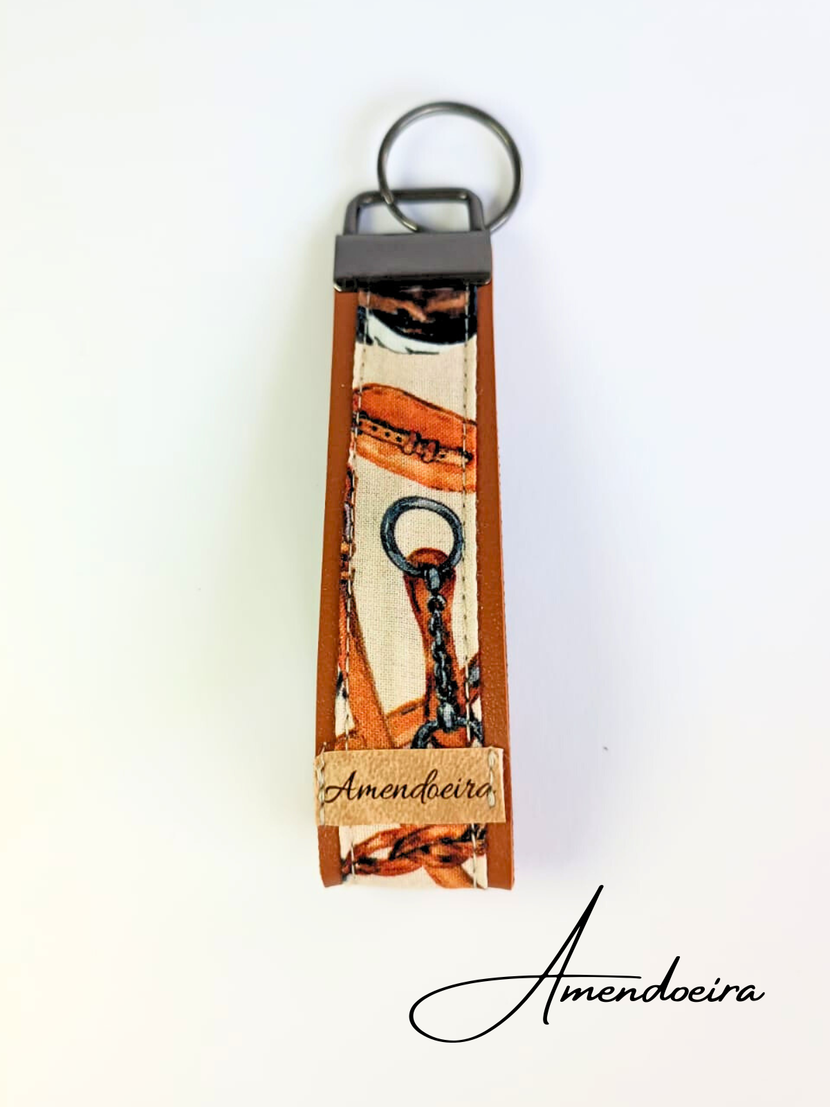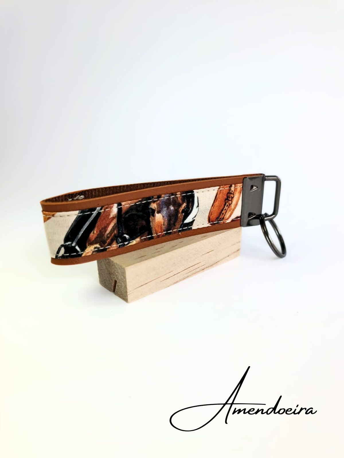 Porta-chaves em material parecido com couro e tecido com padrão do tema Cavalos.