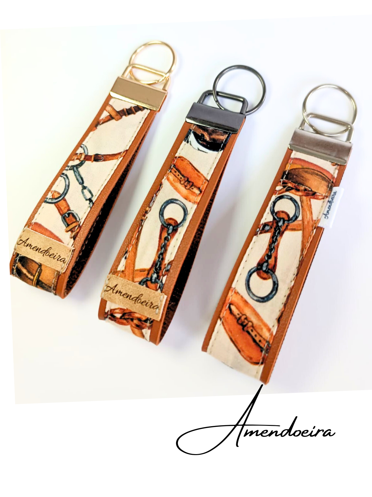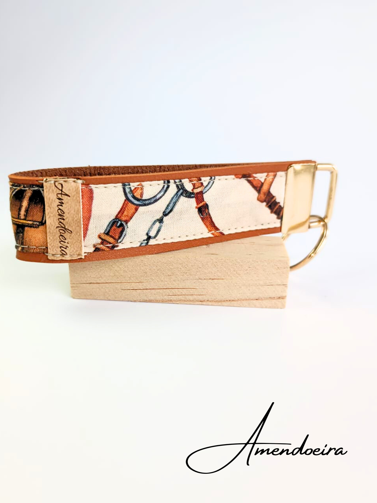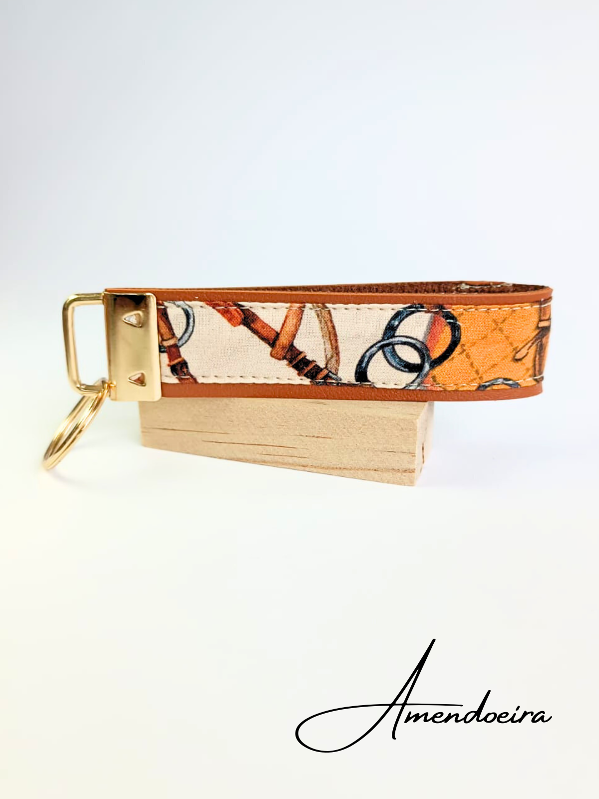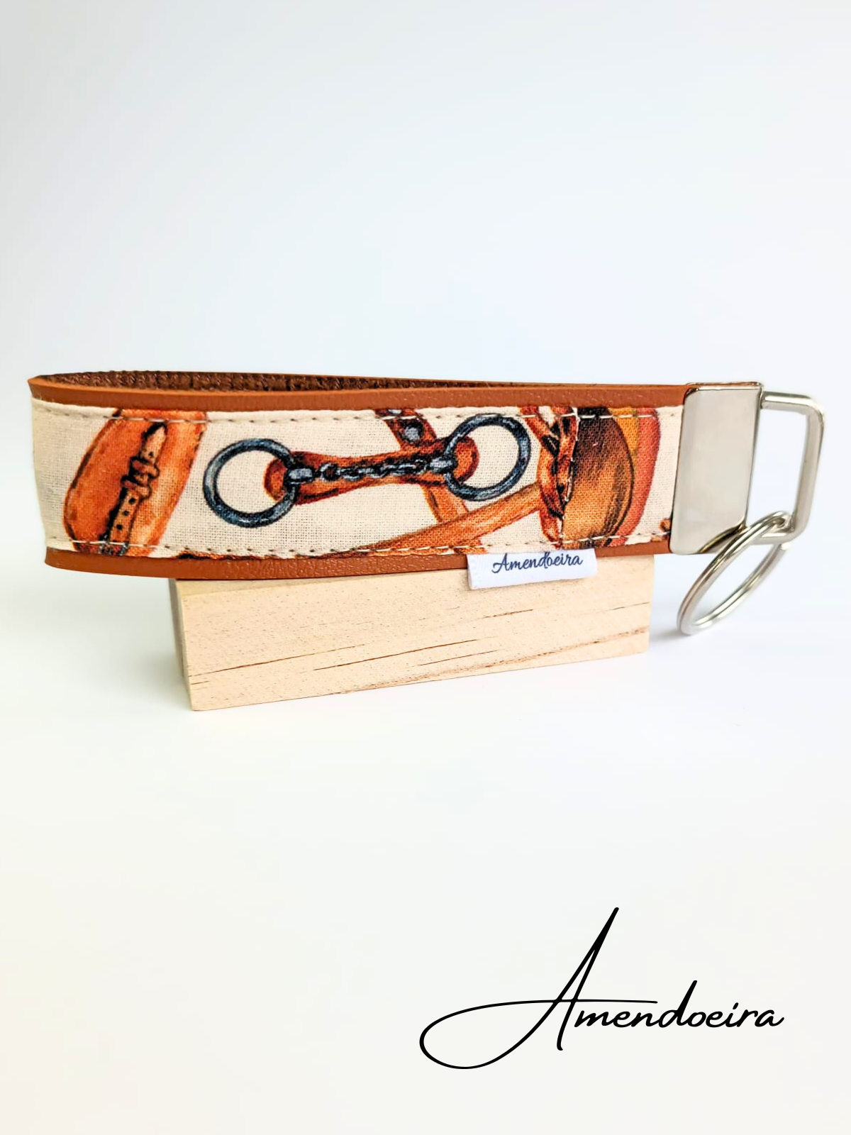Porta-chaves em material parecido com couro e tecido com padrão do tema Cavalos.