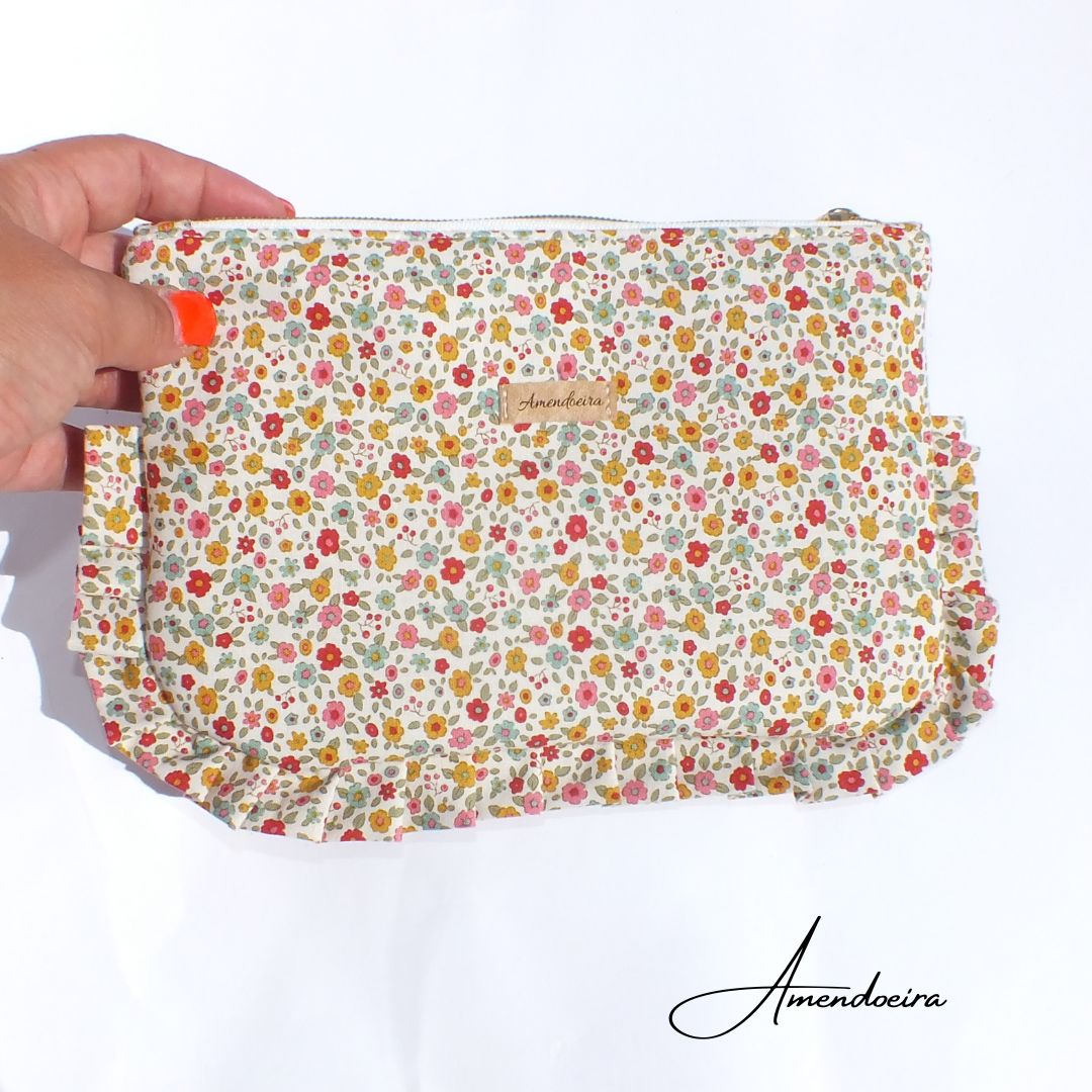 Susan é uma bolsa nécessaire pequena com folhos, essencial para a organização do dia a dia para guardar produtos de higiene femininos ou produtos de bebé.