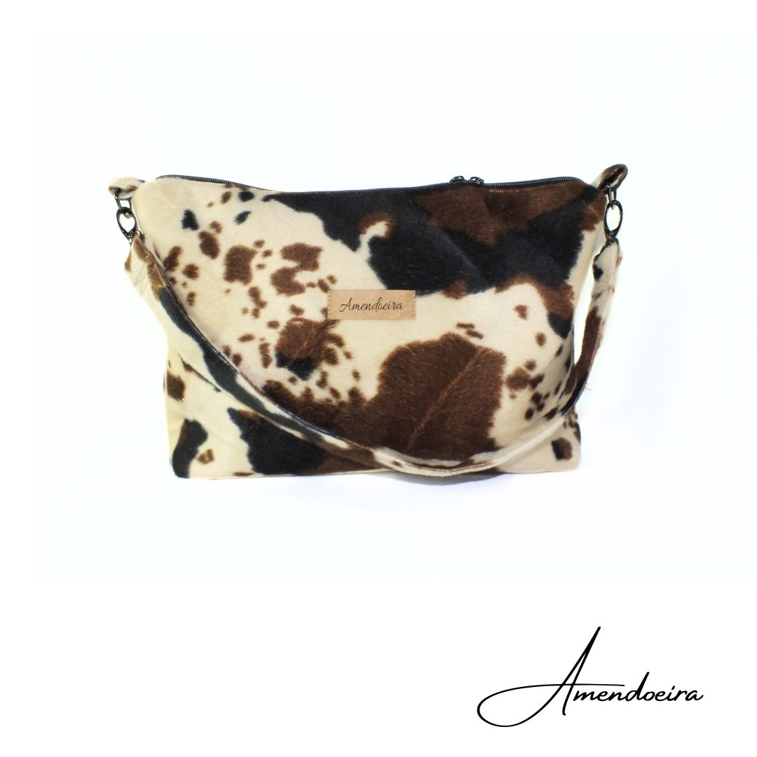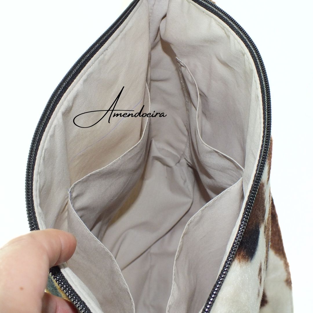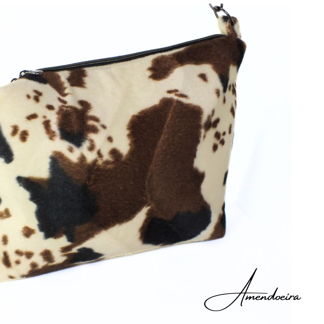 Mala feita em tecido com padrão vaca no tecido exterior e com forro em algodão bege, tem 4 bolsas no interiror para uma melhor organização.